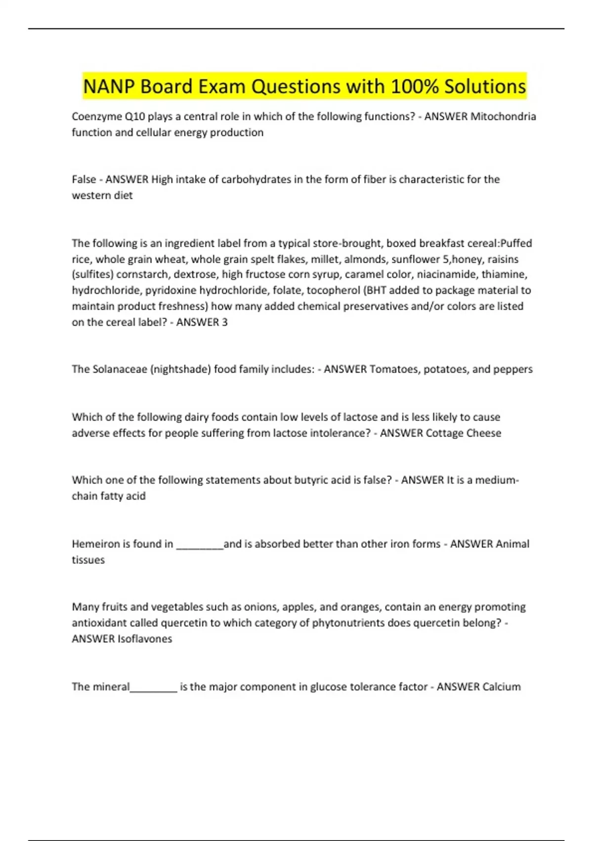 Coenzyme Q10 plays a central role in which of the following functions? - ANSWER Mitochondria function and cellular energy production False - ANSWER High intake of carbohydrates in the form of fiber is characteristic for the western diet The following is an ingredient label from a typical store-brought, boxed breakfast cereal:Puffed rice, whole grain wheat, whole grain spelt flakes, millet, almonds, sunflower 5,honey, raisins (sulfites) cornstarch, dextrose, high fructose corn syrup, caramel color, niacinamide, thiamine, hydrochloride, pyridoxine hydrochloride, folate, tocopherol (BHT added to package material to maintain product freshness) how many added chemical preservatives and/or colors are listed on the cereal label? - ANSWER 3