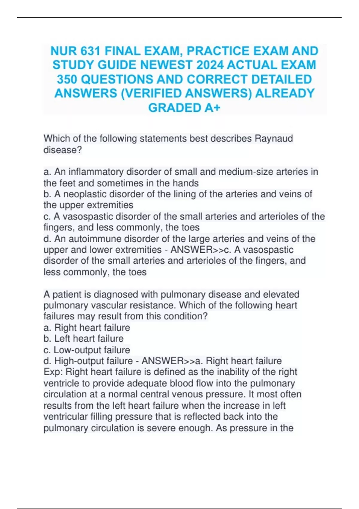 NUR 631 FINAL EXAM, PRACTICE EXAM AND STUDY GUIDE NEWEST 2024 ACTUAL EXAM 350 QUESTIONS AND CORRECT DETAILED ANSWERS (VERIFIED ANSWERS) ALREADY GRADED A+