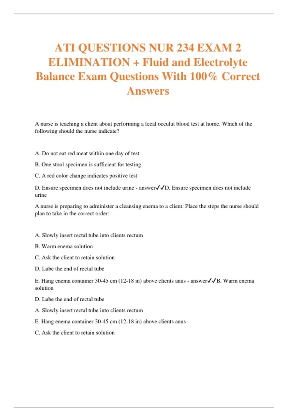 ATI QUESTIONS NUR 234 EXAM 2 ELIMINATION + Fluid and Electrolyte Balance Exam Questions With 100% Correct Answers A nurse is teaching a client about performing a fecal occulut blood test at home. Which of the following should the nurse indicate? A. Do not eat red meat within one day of test B. One stool specimen is sufficient for testing C. A red color change indicates positive test D. Ensure specimen does not include urine - answerD. Ensure specimen does not include urine A nurse is preparing to administer a cleansing enema to a client. Place the steps the nurse should plan to take in the correct order: A. Slowly insert rectal tube into clients rectum B. Warm enema solution C. Ask the client to retain solution D. Lube the end of rectal tube E. Hang enema container 30-45 cm (12-18 in) above clients anus - answerB. Warm enema solution D. Lube the end of rectal tube A. Slowly insert rectal tube into clients rectum E. Hang enema container 30-45 cm (12-18 in) above clients anus C. Ask the client to retain solution Nurse is admin enema to client with abdominal cramping. What actions should nurse take? - answer-Slow the flow of solution by lowering container -Slowing flow of enema decreases abdominal cramping -If severe abdominal cramping, stop enema, assess vital signs, and notify provider A nurse is assessing client who has diarrhea for 3 days. Which of the following should the nurse expect? Select all that apply A. Bradycardia B. Hypotension C. Elevated Temp. D. Peripheral edema E. Poor skin turgor - answerB. Hypotension C. Elevated Temp. E. Poor skin turgor A nurse is teaching a client who has diarrhea. Which of the following instructions should the nurse include? Select all that apply A. Eat raw fruit with the skin B. Eat yogurt when diarrhea has stopped C. Increase fluid intake D. Drink hot fluid E. Avoid caffeinated drinks - answerB. Eat yogurt when diarrhea has stopped C. Increase fluid intake E. Avoid caffeinated drinks A nurse is teaching a client who has recurrent UTIs. Which of the following instructions should the nurse include? A. Urinate after sexual intercourse B. Drink at least 1 L of fluid each day C. Clean perineum from front to back D. Wear nylon undergarments E. Avoid bubble baths - answerA. Urinate after sexual intercourse C. Clean perineum from front to back E. Avoid bubble baths A nurse is teaching a newly licensed nurse about urine specimen collection. Match the following tests to procedure: 1. Collect urine in 24 hr period 2. Obtain non sterile urine specimen 3. Obtain a sterile urine specimen from