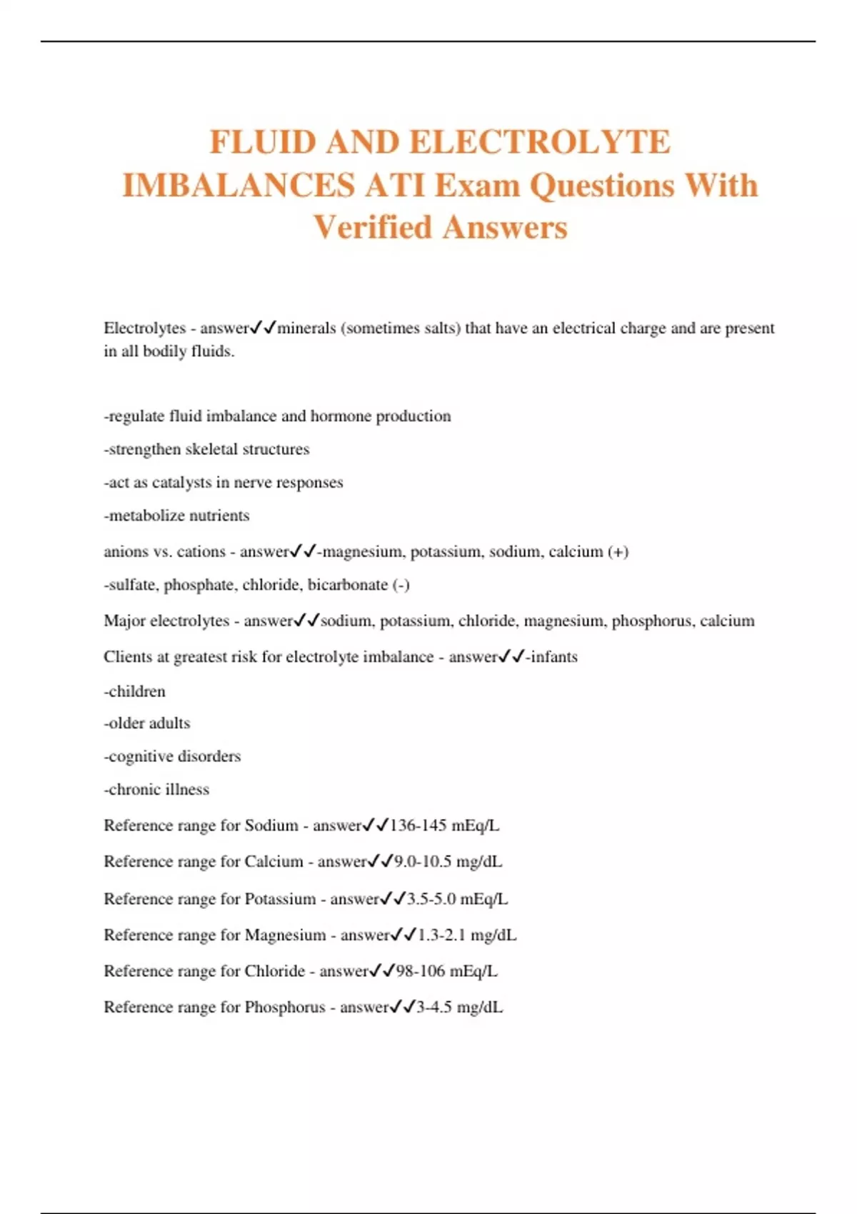 FLUID AND ELECTROLYTE IMBALANCES ATI Exam Questions With Verified Answers Electrolytes - answerminerals (sometimes salts) that have an electrical charge and are present in all bodily fluids. -regulate fluid imbalance and hormone production -strengthen skeletal structures -act as catalysts in nerve responses -metabolize nutrients anions vs. cations - answer-magnesium, potassium, sodium, calcium (+) -sulfate, phosphate, chloride, bicarbonate (-) Major electrolytes - answersodium, potassium, chloride, magnesium, phosphorus, calcium Clients at greatest risk for electrolyte imbalance - answer-infants -children -older adults -cognitive disorders -chronic illness Reference range for Sodium - answer136-145 mEq/L Reference range for Calcium - answer9.0-10.5 mg/dL Reference range for Potassium - answer3.5-5.0 mEq/L Reference range for Magnesium - answer1.3-2.1 mg/dL Reference range for Chloride - answer98-106 mEq/L Reference range for Phosphorus - answer3-4.5 mg/dL Sodium (Na+) - answermajor electrolyte found in ECF and is present in most bodily fluids/secretions. -essential for acid/base fluid balance -active/passive transport -irritability and conduction of nerve/muscle tissue Hyponatremia - answerBlood sodium level less than 136 mEq/L -results from excess water in plasma or loss of sodium rich fluids. -delays and slows depolarization of membranes -water moves from ECF to ICF which causes cells in the body to swell Risk factors of hyponatremia - answer-deficit ECF volume -excessive GI losses: vomiting, NG suctioning, diarrhea, enemas -renal losses: diuretics, kidney disease, adrenal insufficiency, excessive sweating -skin losses: burns, wound drainage, peripheral edema, ascites -excessive water intake, SIADH -heart failure/cirrhosis/nephrotic syndrome -excessive administration of dextrose -inadequate sodium intake (NPO status) -use of hypotonic irrigating solutions -hyperglycemia -greater risk for older adults due to increased chronic illnesses (diuretics, insufficient intake) Expected findings in hyponatremia - answerphysical: vary with a normal/decreased ECF volume VS: hypothermia, tachycardia, rapid thready pulse, hypotension, orthostatic hypotension musculoskeletal: headache, confusion, lethargy, muscle weakness/respiratory compromise, fatigue, decreased deep tendon reflexes