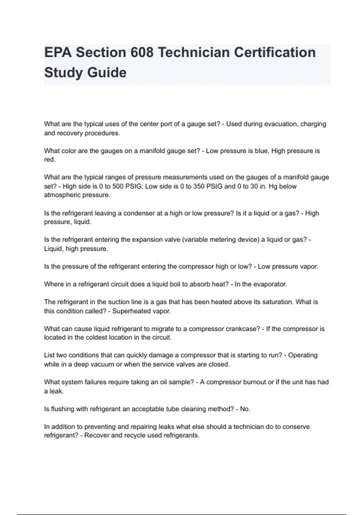 EPA Section 608 Technician Certification Study Guide Questions And Answers` What are the typical uses of the center port of a gauge set? - Used during evacuation, charging and recovery procedures. What color are the gauges on a manifold gauge set? - Low pressure is blue, High pressure is red. What are the typical ranges of pressure measurements used on the gauges of a manifold gauge set? - High side is 0 to 500 PSIG; Low side is 0 to 350 PSIG and 0 to 30 in. Hg below atmospheric pressure. Is the refrigerant leaving a condenser at a high or low pressure? Is it a liquid or a gas? - High pressure, liquid. Is the refrigerant entering the expansion valve (variable metering device) a liquid or gas? - Liquid, high pressure. Is the pressure of the refrigerant entering the compressor high or low? - Low pressure vapor. Where in a refrigerant circuit does a liquid boil to absorb heat? - In the evaporator. The refrigerant in the suction line is a gas that has been heated above its saturation. What is this condition called? - Superheated vapor. What can cause liquid refrigerant to migrate to a compressor crankcase? - If the compressor is located in the coldest location in the circuit. List two conditions that can quickly damage a compressor that is starting to run? - Operating while in a deep vacuum or when the service valves are closed. What system failures require taking an oil sample? - A compressor burnout or if the unit has had a leak. Is flushing with refrigerant an acceptable tube cleaning method? - No. In addition to preventing and repairing leaks what else should a technician do to conserve refrigerant? - Recover and recycle used refrigerants. What factors affect the speed of an evacuation? - Pump size, hose length, hose diameter, size of system to be evacuated, ambient temperature, suction line size, and the amount of moisture in the system. How should gauge set hoses be sized for use in evacuating a system? - Use the shortest length and the largest diameter possible for the quickest evacuation. At least as large as the vacuum pump inlet. When evacuating what is the benefit of using short hoses with large diameters? - Reduces emissions, pressure drop and evacuation time. Which connection determines the preferred size of hoses used with a vacuum pump? - The vacuum pump inlet.