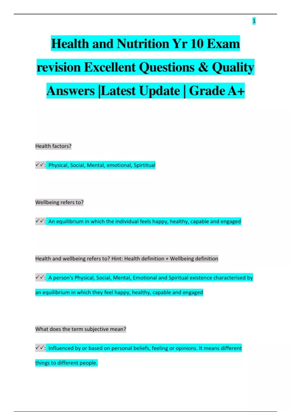 Health and Nutrition Yr 10 Exam revision Excellent Questions & Quality Answers |Latest Update | Grade A+