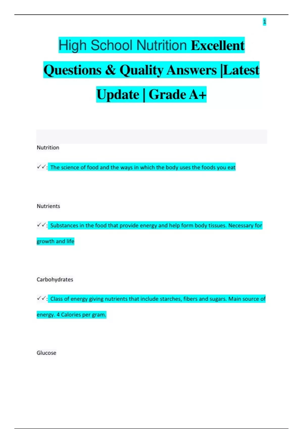 High School Nutrition Excellent Questions & Quality Answers |Latest Update | Grade A+