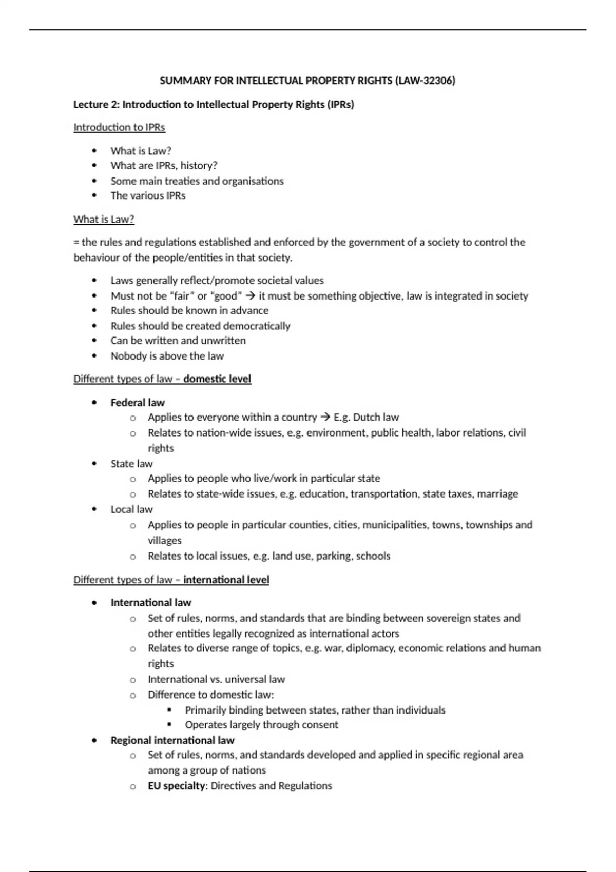 GRADE: 7. This document is a summary of the course Intellectual Property Rights (LAW-32306). It includes lectures 1 through 7. Please note that this summary was written during the 2023/2024 academic year, and the content may have changed since then. Therefore, consider these documents as supplementary support for your exam preparation and not as your sole study guide.