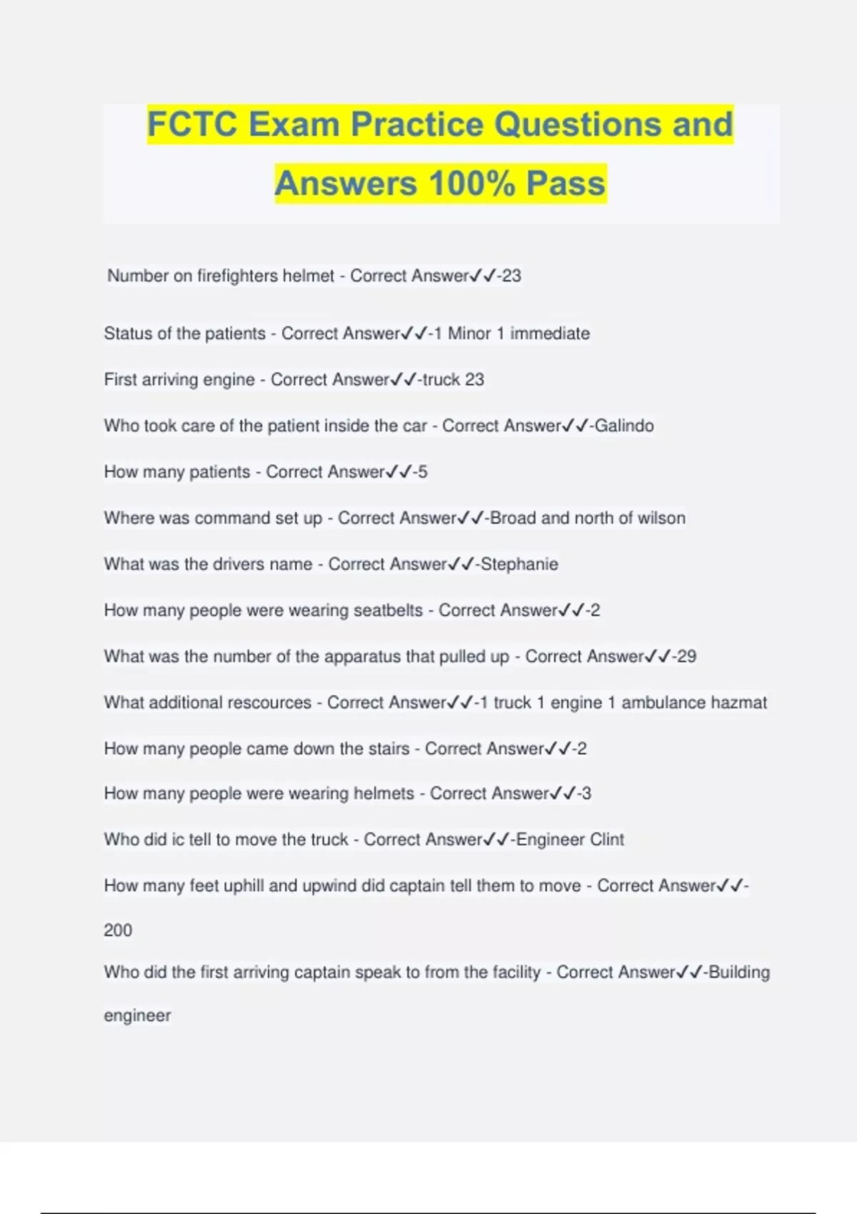FCTC Exam Practice Questions and Answers 100% Pass Number on firefighters helmet - Correct Answer️️ -23 Status of the patients - Correct Answer️️ -1 Minor 1 immediate First arriving engine - Correct Answer️️ -truck 23 Who took care of the patient inside the car - Correct Answer️️ -Galindo How many patients - Correct Answer️️ -5 Where was command set up - Correct Answer️️ -Broad and north of wilson What was the drivers name - Correct Answer️️ -Stephanie How many people were wearing seatbelts - Correct Answer️️ -2 What was the number of the apparatus that pulled up - Correct Answer️️ -29