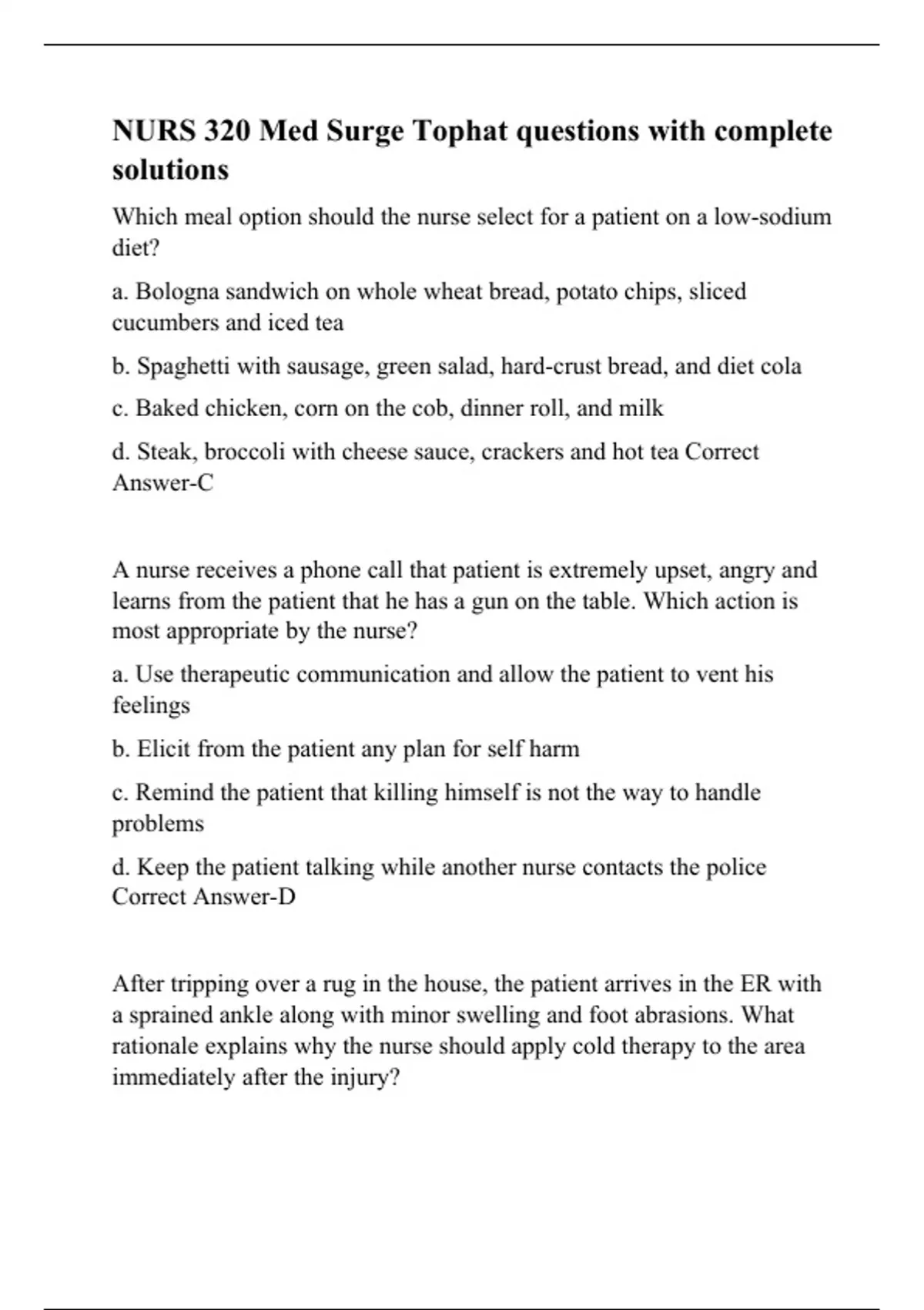 Which meal option should the nurse select for a patient on a low-sodium diet? a. Bologna sandwich on whole wheat bread, potato chips, sliced cucumbers and iced tea b. Spaghetti with sausage, green salad, hard-crust bread, and diet cola c. Baked chicken, corn on the cob, dinner roll, and milk d. Steak, broccoli with cheese sauce, crackers and hot tea Correct Answer-C A nurse receives a phone call that patient is extremely upset, angry and learns from the patient that he has a gun on the table. Which action is most appropriate by the nurse? a. Use therapeutic communication and allow the patient to vent his feelings b. Elicit from the patient any plan for self harm c. Remind the patient that killing himself is not the way to handle problems d. Keep the patient talking while another nurse contacts the police Correct Answer-D After tripping over a rug in the house, the patient arrives in the ER with a sprained ankle along with minor swelling and foot abrasions. What rationale explains why the nurse should apply cold therapy to the area immediately after the injury? a. Reduce the body's temp