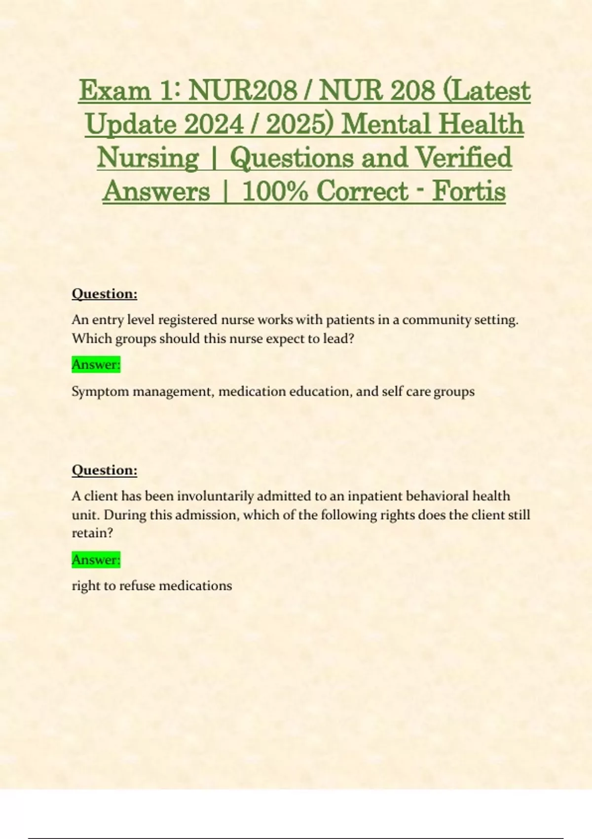 Exam 1: NUR208 / NUR 208 (Latest Update 2024 / 2025) Mental Health Nursing | Questions and Verified Answers | 100% Correct - Fortis
