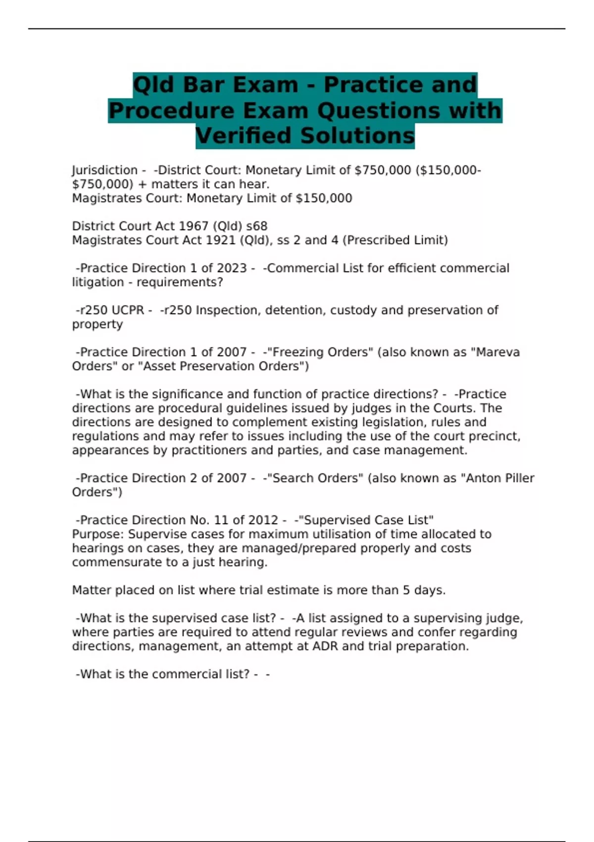 Qld Bar Exam - Practice and Procedure Exam Questions with Verified Solutions
