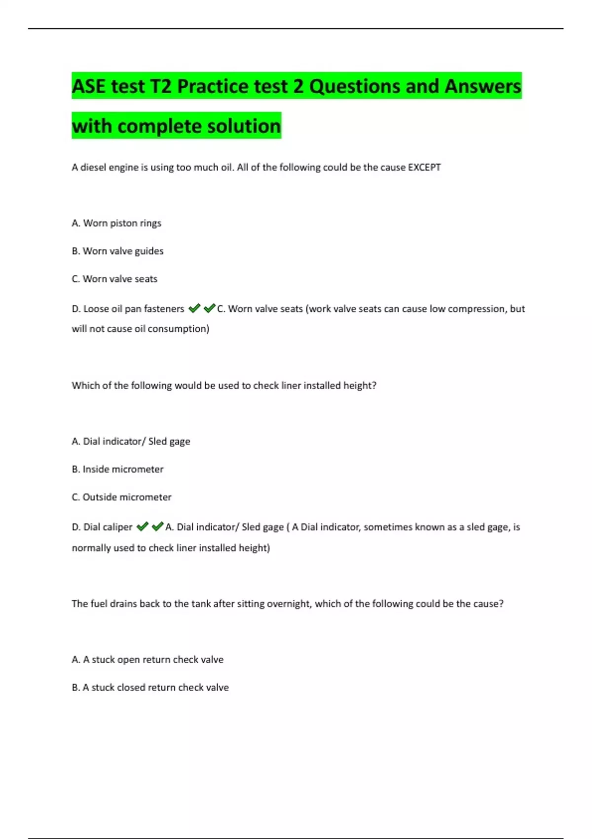 A diesel engine is using too much oil. All of the following could be the cause EXCEPT A. Worn piston rings B. Worn valve guides C. Worn valve seats D. Loose oil pan fasteners C. Worn valve seats (work valve seats can cause low compression, but will not cause oil consumption) Which of the following would be used to check liner installed height? A. Dial indicator/ Sled gage B. Inside micrometer C. Outside micrometer D. Dial caliper A. Dial indicator/ Sled gage ( A Dial indicator, sometimes known as a sled gage, is normally used to check liner installed height) The fuel drains back to the tank after sitting overnight, which of the following could be the cause? A. A stuck open return check valve B. A stuck closed return check valve