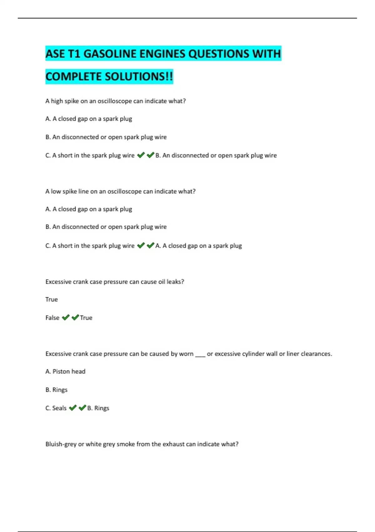 A high spike on an oscilloscope can indicate what? A. A closed gap on a spark plug B. An disconnected or open spark plug wire C. A short in the spark plug wire B. An disconnected or open spark plug wire A low spike line on an oscilloscope can indicate what? A. A closed gap on a spark plug B. An disconnected or open spark plug wire C. A short in the spark plug wire A. A closed gap on a spark plug Excessive crank case pressure can cause oil leaks? True False True Excessive crank case pressure can be caused by worn ___ or excessive cylinder wall or liner clearances. A. Piston head B. Rings C. Seals B. Rings