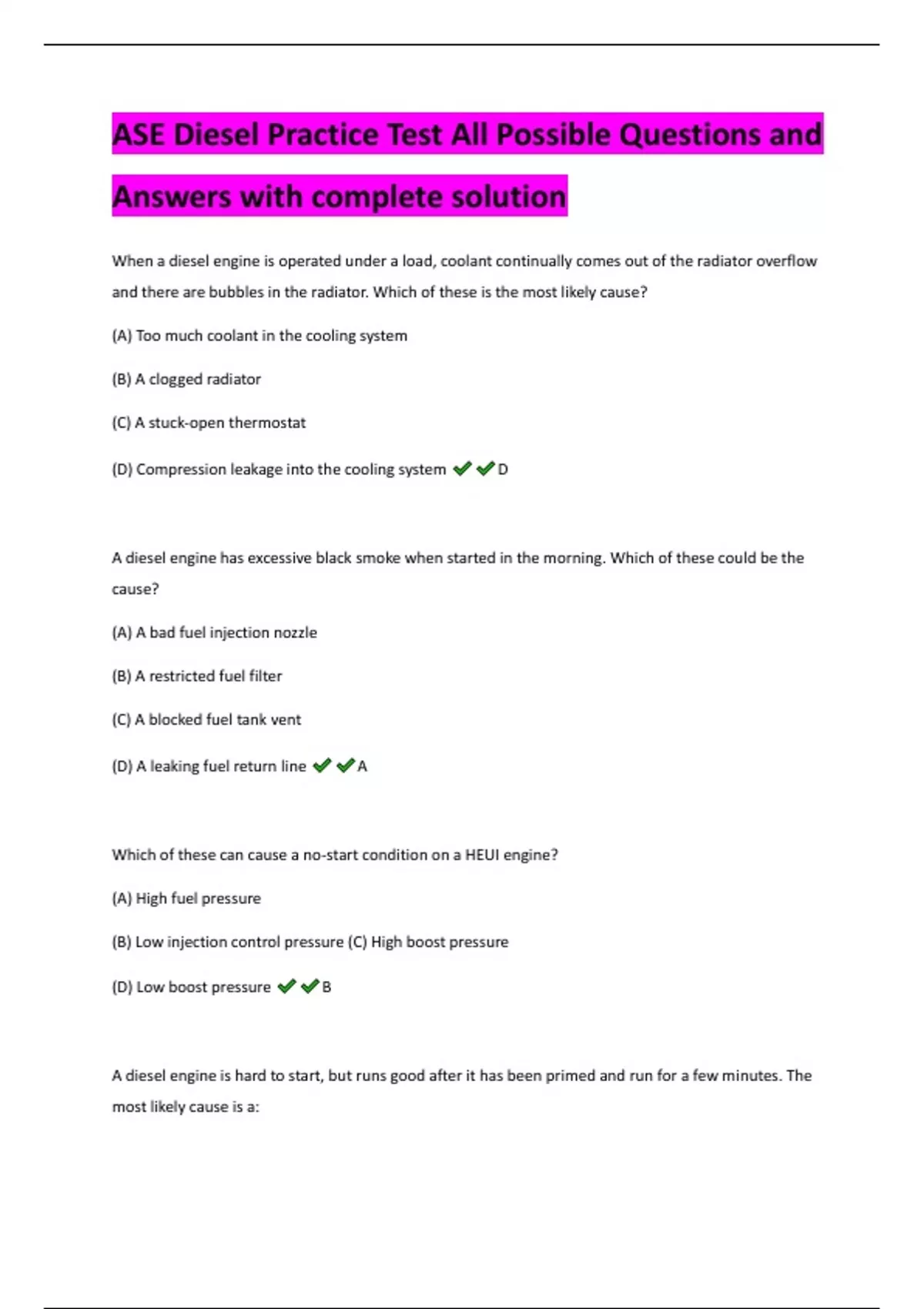 ASE Diesel Practice Test All Possible Questions and Answers with complete solution
