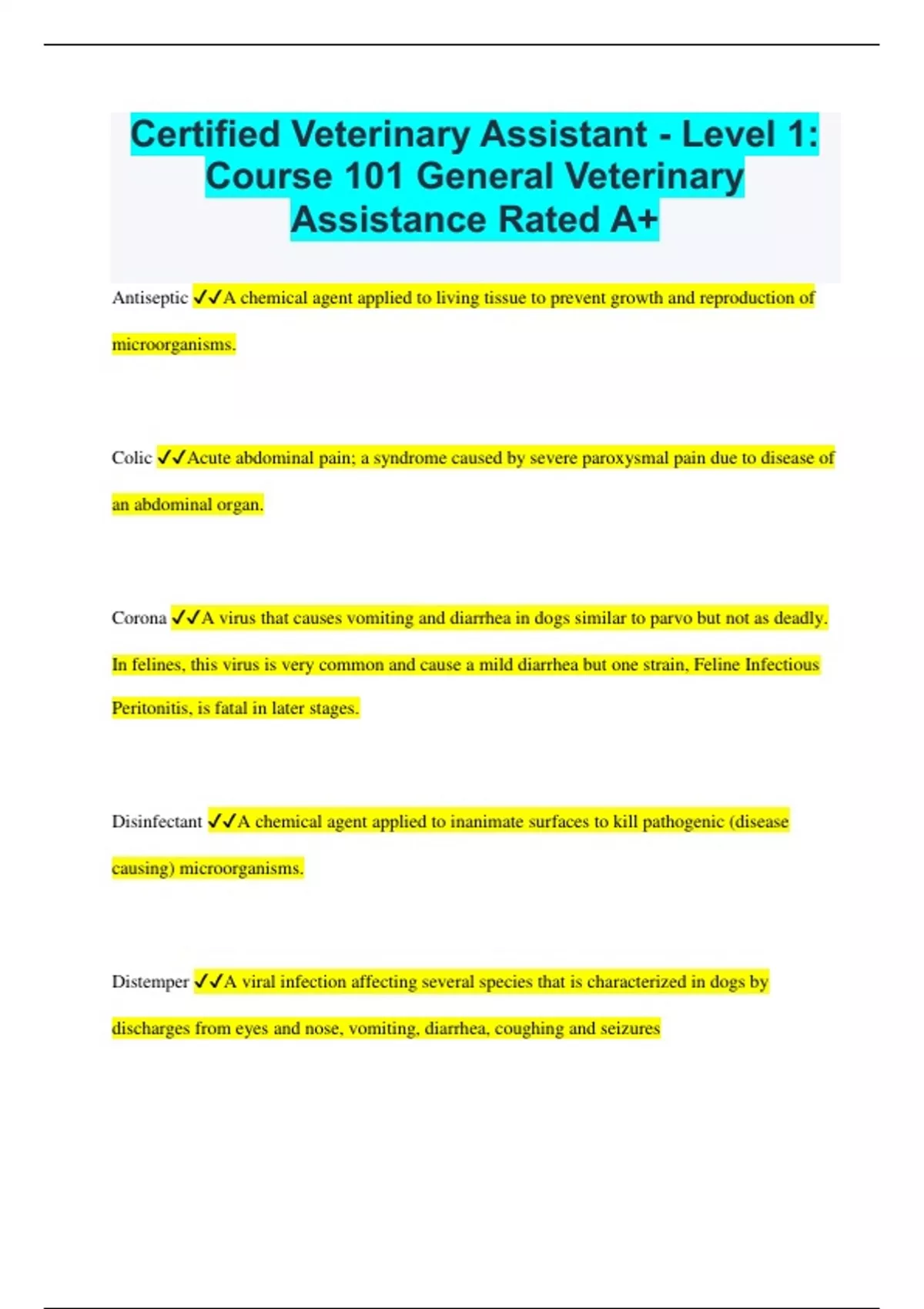Certified Veterinary Assistant - Level 1: Course 101 General Veterinary Assistance Rated A+ Antiseptic A chemical agent applied to living tissue to prevent growth and reproduction of microorganisms. Colic Acute abdominal pain; a syndrome caused by severe paroxysmal pain due to disease of an abdominal organ. Corona A virus that causes vomiting and diarrhea in dogs similar to parvo but not as deadly. In felines, this virus is very common and cause a mild diarrhea but one strain, Feline Infectious Peritonitis, is fatal in later stages. Disinfectant A chemical agent applied to inanimate surfaces to kill pathogenic (disease causing) microorganisms. Distemper A viral infection affecting several species that is characterized in dogs by discharges from eyes and nose, vomiting, diarrhea, coughing and seizures Fomite An object that can be contaminated which aids in the spread of microorganisms. Inanimate objects, such as shoes, bowls, leashes, litter pans, surfaces of cages, brooms, and mops are examples of this. Heartworm The common name for Dirofilaria immitis. Functional/Protective Immunity The condition of being immune; security against a particular disease; non-susceptibility to the invasive or pathogenic effects of microorganisms or helminth parasites or to the toxic effect of antigenic substances. Humoral and Cell-Mediated Immunity Responsiveness to antigen that leads to more rapid binding or elimination of antigen than in the non-immune state. Immunity The capacity to distinguish foreign material from itself, and to neutralize, eliminate or metabolize that which is foreign by the physiological mechanisms of the immune response. Passive Immunity Protection that is transferred from one animal (or person) that has a specific antibodies to an antigen that the recipient may not have and the antibodies are transferred as performed antibodies. This transfer can take place through the placenta, the mother's colostrum (first milk), a blood plasma transfusion, or an injection of gamma globulin. Active Immunity Refers to the development of antibody protection in response to vaccination or natural infection. Parvo/Parvovirus A viral infection which may affect cattle, dogs, cats and swine. Most commonly seen in dogs in which the clinical signs are vomiting and diarrhea, often with blood, high fever and dehydration. In felines, the disease is known as feline panleucopenia which is also a vomiting and diarrhea disease. Rabies A highly fatal viral infection of the nervous system which affects all warm-blooded animal species. Rabies is one of the most important zoonoses because