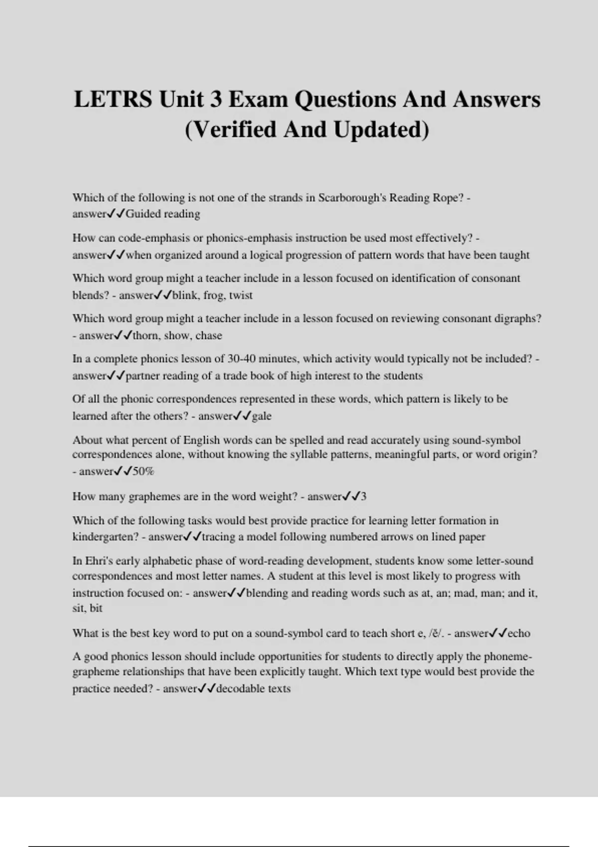 LETRS Unit 3 Exam Questions And Answers (Verified And Updated)