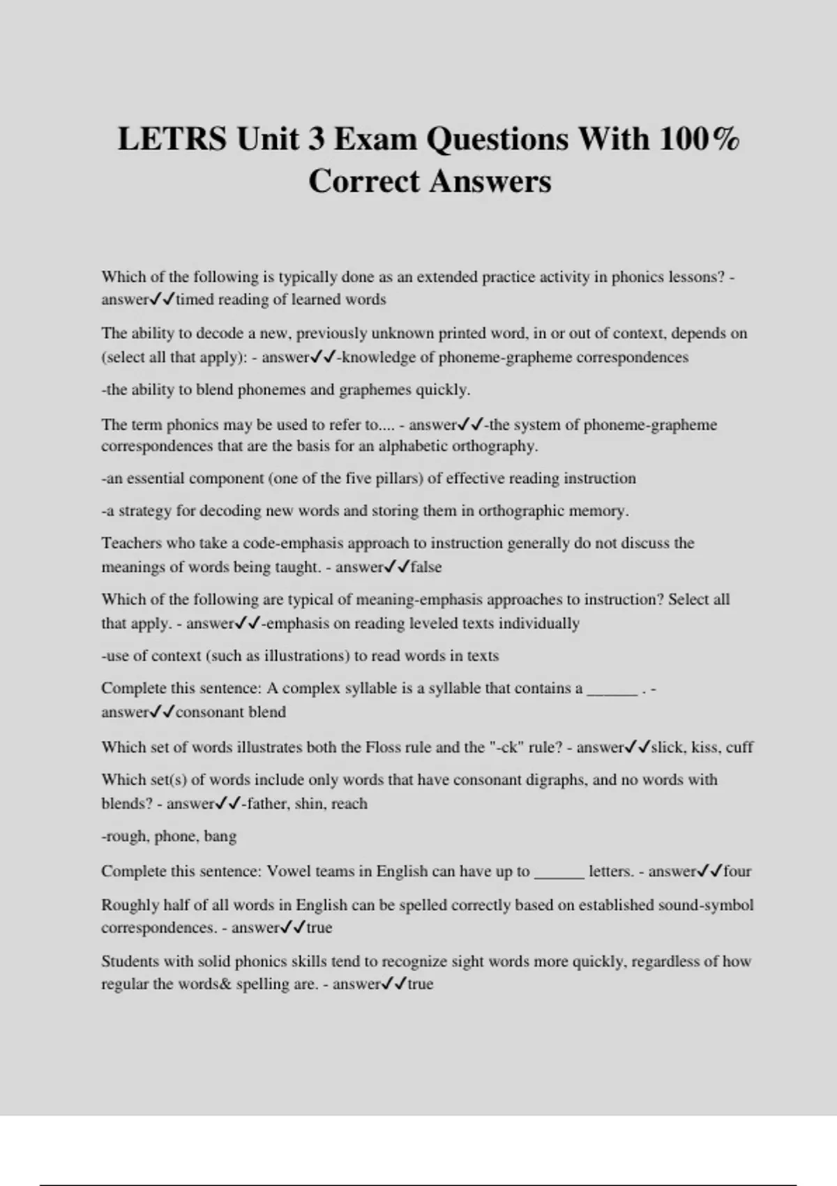 LETRS Unit 3 Exam Questions With 100% Correct Answers Which of the following is typically done as an extended practice activity in phonics lessons? - answertimed reading of learned words The ability to decode a new, previously unknown printed word, in or out of context, depends on (select all that apply): - answer-knowledge of phoneme-grapheme correspondences -the ability to blend phonemes and graphemes quickly. The term phonics may be used to refer to.... - answer-the system of phoneme-grapheme correspondences that are the basis for an alphabetic orthography. -an essential component (one of the five pillars) of effective reading instruction -a strategy for decoding new words and storing them in orthographic memory. Teachers who take a code-emphasis approach to instruction generally do not discuss the meanings of words being taught. - answerfalse Which of the following are typical of meaning-emphasis approaches to instruction? Select all that apply. - answer-emphasis on reading leveled texts individually -use of context (such as illustrations) to read words in texts Complete this sentence: A complex syllable is a syllable that contains a ______ . - answerconsonant blend Which set of words illustrates both the Floss rule and the "-ck" rule? - answerslick, kiss, cuff Which set(s) of words include only words that have consonant digraphs, and no words with blends? - answer-father, shin, reach -rough, phone, bang Complete this sentence: Vowel teams in English can have up to ______ letters. - answerfour Roughly half of all words in English can be spelled correctly based on established sound-symbol correspondences. - answertrue Students with solid phonics skills tend to recognize sight words more quickly, regardless of how regular the words& spelling are. - answertrue