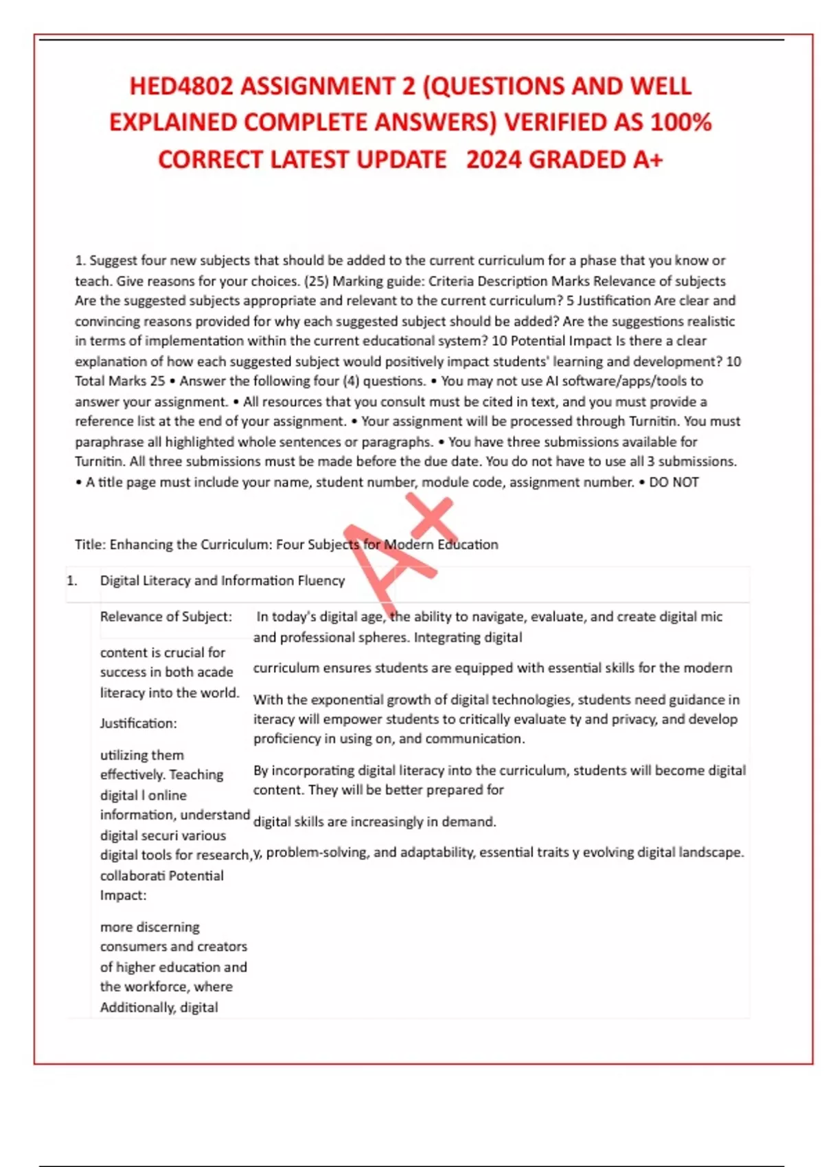 HED4802 ASSIGNMENT 2 (QUESTIONS AND WELL EXPLAINED COMPLETE ANSWERS) VERIFIED AS 100% CORRECT LATEST UPDATE 2024 GRADED A+ 1. Suggest four new subjects that should be added to the current curriculum for a phase that you know or teach. Give reasons for your choices. (25) Marking guide: Criteria Description Marks Relevance of subjects Are the suggested subjects appropriate and relevant to the current curriculum? 5 Justification Are clear and convincing reasons provided for why each suggested subject should be added? Are the suggestions realistic in terms of implementation within the current educational system? 10 Potential Impact Is there a clear explanation of how each suggested subject would positively impact students' learning and development? 10 Total Marks 25 • Answer the following four (4) questions. • You may not use AI software/apps/tools to answer your assignment. • All resources that you consult must be cited in text, and you must provide a reference list at the end of your assignment. • Your assignment will be processed through Turnitin. You must paraphrase all highlighted whole sentences or paragraphs. • You have three submissions available for Turnitin. All three submissions must be made before the due date. You do not have to use all 3 submissions. • A title page must include your name, student number, module code, assignment number. • DO NOT Title: Enhancing the Curriculum: Four Subjects for Modern Education 1. Digital Literacy and Information Fluency Relevance of Subject: In today's digital age, the ability to navigate, evaluate, and create digital mic and professional spheres. Integrating digital curriculum ensures students are equipped with essential skills for the modern With the exponential growth of digital technologies, students need guidance in iteracy will empower students to critically evaluate ty and privacy, and develop proficiency in using on, and communication. By incorporating digital literacy into the curriculum, students will become digital content. They will be better prepared for digital skills are increasingly in demand. y, problem-solving, and adaptability, essential traits y evolving digital landscape.