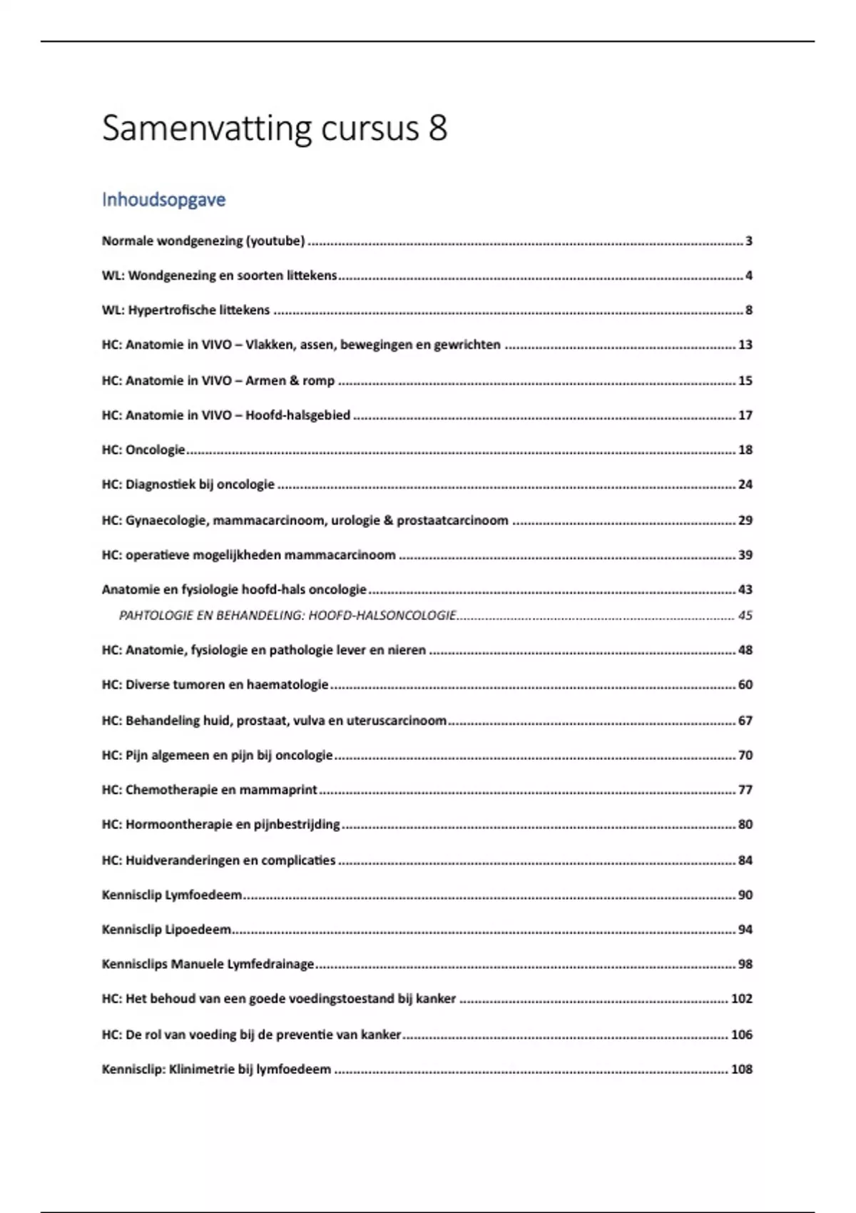Een complete samenvatting van alle hoorcollege's en kennisclips van cursus 8, oncologie en complexe zorgverlening. Dit blok behoort tot jaar 2 van de opleiding huidtherapie. De gehele samenvatting is compleet en ook informatie van klinieklessen is erin verwerkt.