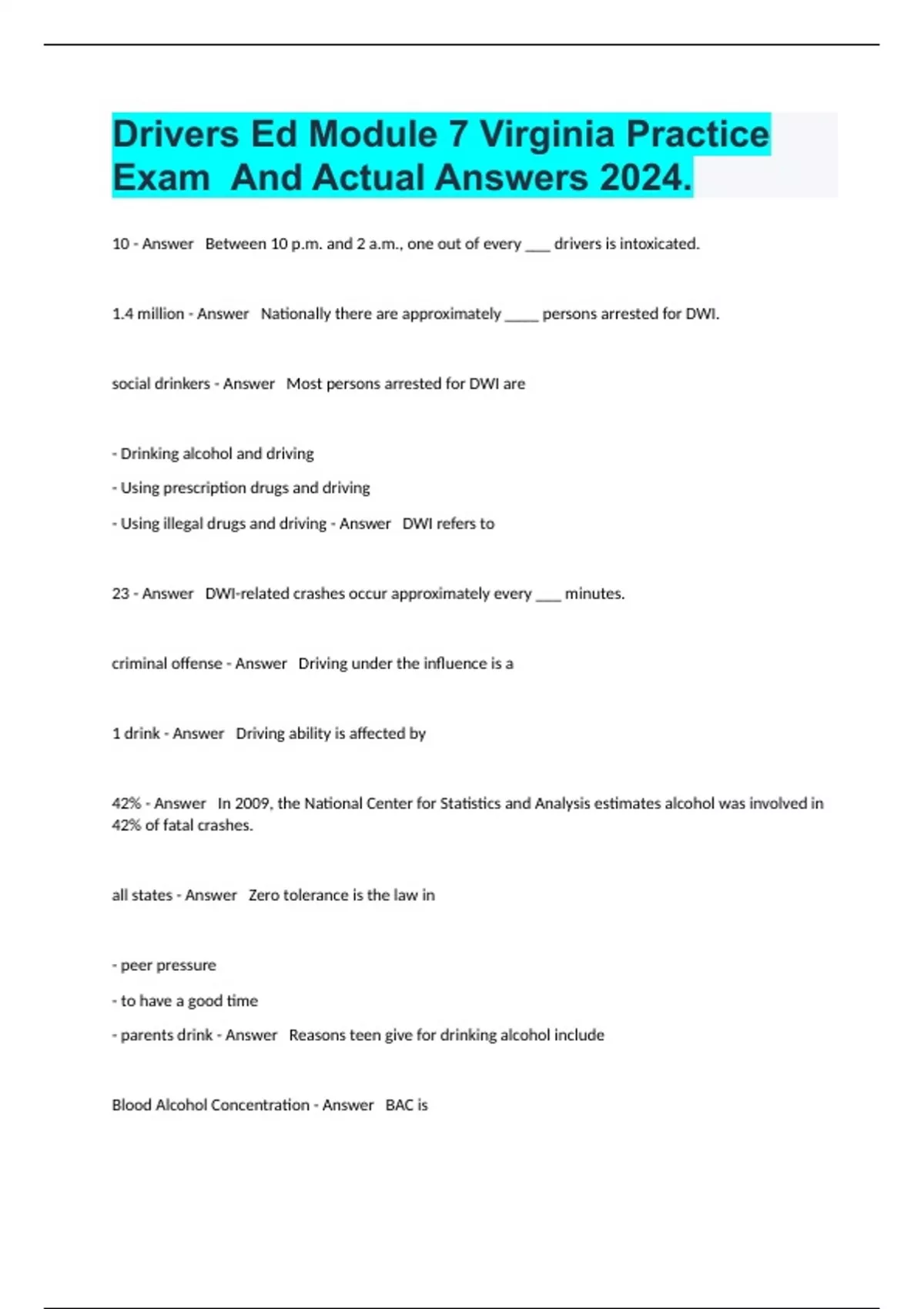 Drivers Ed Module 7 Virginia Practice Exam And Actual Answers 2024.