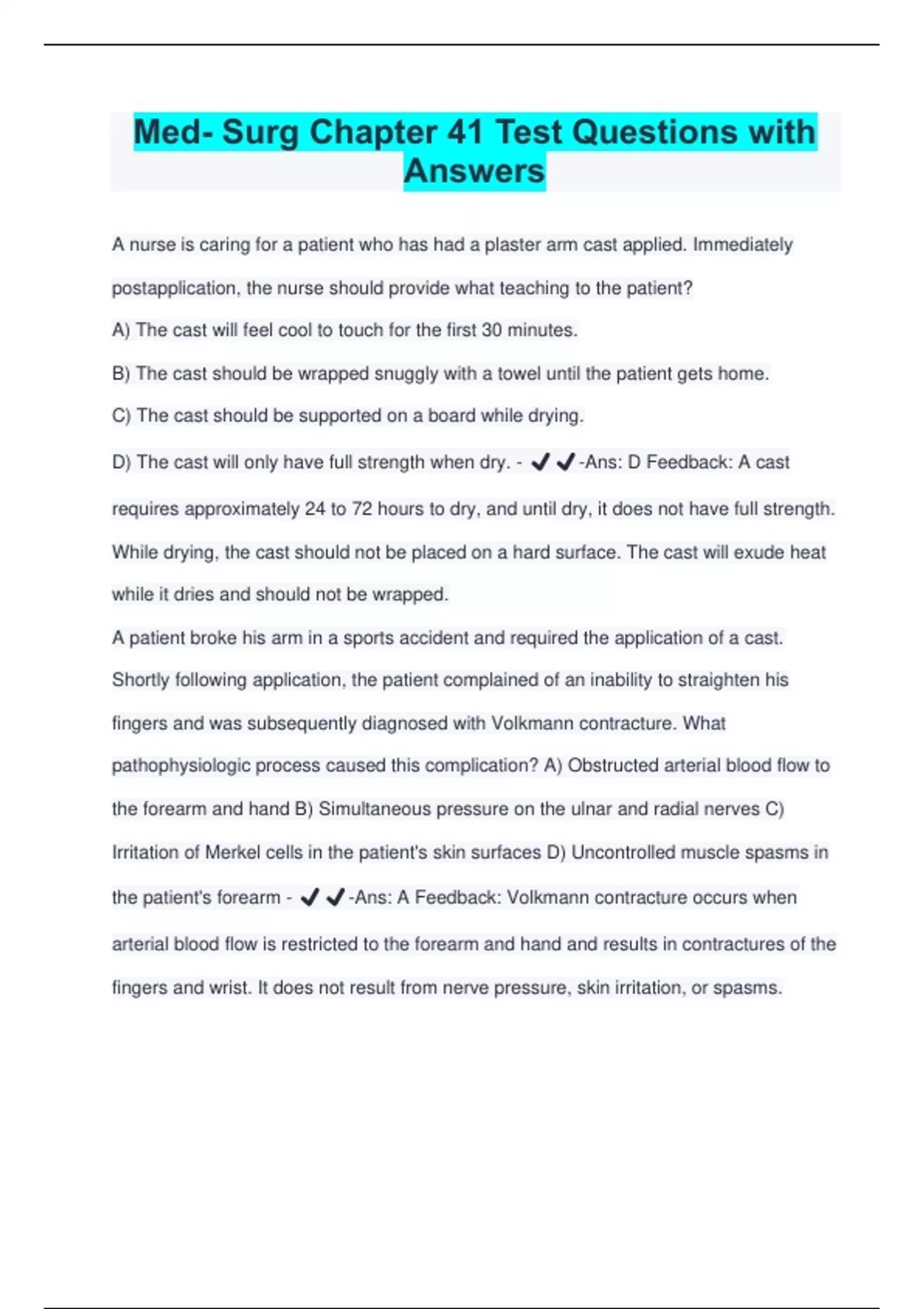 Med- Surg Chapter 41 Test Questions with Answers A nurse is caring for a patient who has had a plaster arm cast applied. Immediately postapplication, the nurse should provide what teaching to the patient? A) The cast will feel cool to touch for the first 30 minutes. B) The cast should be wrapped snuggly with a towel until the patient gets home. C) The cast should be supported on a board while drying. D) The cast will only have full strength when dry. - ️️ -Ans: D Feedback: A cast requires approximately 24 to 72 hours to dry, and until dry, it does not have full strength. While drying, the cast should not be placed on a hard surface. The cast will exude heat while it dries and should not be wrapped. A patient broke his arm in a sports accident and required the application of a cast. Shortly following application, the patient complained of an inability to straighten his fingers and was subsequently diagnosed with Volkmann contracture. What pathophysiologic process caused this complication? A) Obstructed arterial blood flow to the forearm and hand B) Simultaneous pressure on the ulnar and radial nerves C) Irritation of Merkel cells in the patient's skin surfaces D) Uncontrolled muscle spasms in the patient's forearm - ️️ -Ans: A Feedback: Volkmann contracture occurs when arterial blood flow is restricted to the forearm and hand and results in contractures of the fingers and wrist. It does not result from nerve pressure, skin irritation, or spasms. A patient is admitted to the unit in traction for a fractured proximal femur and requires traction prior to surgery. What is the most appropriate type of traction to apply to a fractured proximal femur? A) Russell's traction B) Dunlop's traction C) Buck's extension traction D) Cervical head halter - ️️ -Ans: C Feedback: Buck's extension is used for fractures of the proximal femur. Russell's traction is used for lower leg fractures. Dunlop's traction is applied to the upper extremity for supracondylar fractures of the elbow and humerus. Cervical head halters are used to stabilize the neck. A nurse is caring for a patient who is in skeletal traction. To prevent the complication of skin breakdown in a patient with skeletal traction, what action should be included in the plan of care? A) Apply occlusive dressings to the pin sites. B) Encourage the patient to push up with the elbows when repositioning. C) Encourage the patient to perform isometric exercises once a shift. D) Assess the pin insertion site every 8 hours. - ️️ -Ans: D Feedback: The pin insertion site should be assessed every 8 hours for inflammation and infection. Loose cover dressings should be applied to pin sites. The patient should be encouraged to use the overhead trapeze to shift weight for repositioning. Isometric exercises should be done 10 times an hour while awake. A nurse is caring for a patient who is postoperative day 1 right hip replacement. How should the nurse position the patient? A) Keep the patient's hips in abduction at all times. B) Keep hips flexed at no less than 90 degrees. C) Elevate the head of the bed to high Fowler's. D) Seat the patient in a low chair as soon as possible. - ️️ -Ans: A Feedback: The hips should be kept in abduction by an abductor pillow. Hips should not be flexed more than 90 degrees, and the head of bed should not be elevated more than 60 degrees. The patient's hips should be higher than the knees; as such, high seat chairs should be used. While assessing a patient who has had knee replacement surgery, the nurse notes that the patient has developed a hematoma at the surgical site. The affected leg has a decreased pedal pulse. What would be the priority nursing diagnosis for this patient? A) Risk for Infection B) Risk for Peripheral Neurovascular Dysfunction C) Unilateral Neglect D) Disturbed Kinesthetic Sensory Perception - ️️ -Ans: B Feedback: The hematoma may cause an interruption of tissue perfusion, so the most appropriate nursing diagnosis is Risk of Peripheral Neurovascular Dysfunction. There is also an associated risk for infection because of the hematoma, but impaired neurovascular function is a more acute threat. Unilateral neglect and impaired sensation are lower priorities than neurovascular status. A patient was brought to the emergency department after a fall. The patient is taken to the operating room to receive a right hip prosthesis. In the immediate postoperative period, what health education should the nurse emphasize? A) "Make sure you don't bring your knees close together." B) "Try to lie as still as possible for the first few days." C) "Try to avoid bending your knees until next week." D) "Keep your legs hig