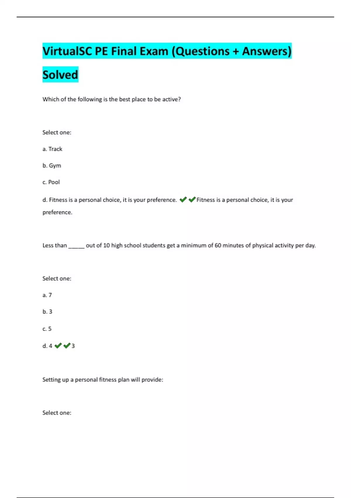 Which of the following is the best place to be active? Select one: a. Track b. Gym c. Pool d. Fitness is a personal choice, it is your preference. Fitness is a personal choice, it is your preference. Less than _____ out of 10 high school students get a minimum of 60 minutes of physical activity per day. Select one: a. 7 b. 3 c. 5 d. 4 3 Setting up a personal fitness plan will provide: Select one