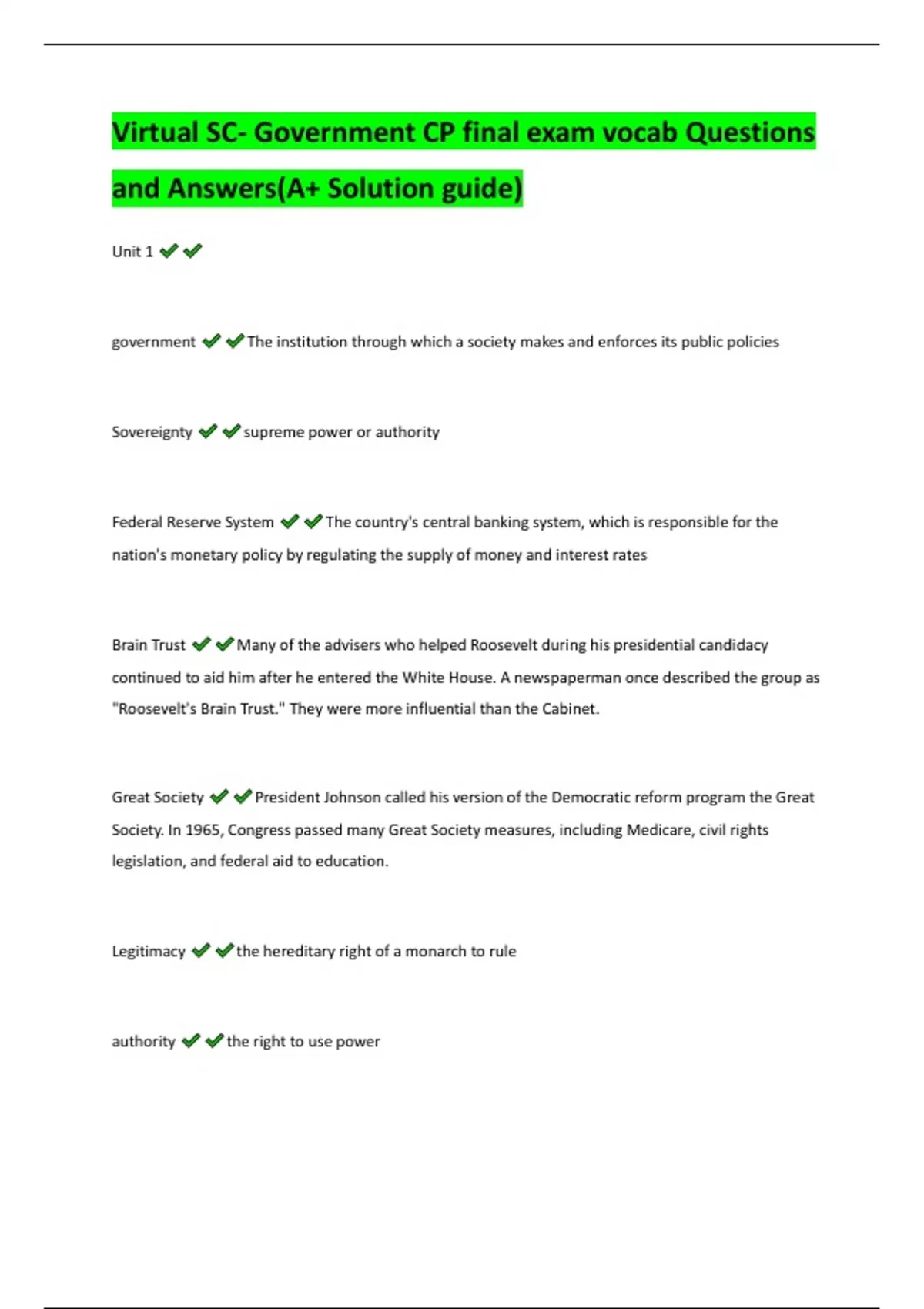 Virtual SC- Government CP final exam vocab Questions and Answers(A+ Solution guide)