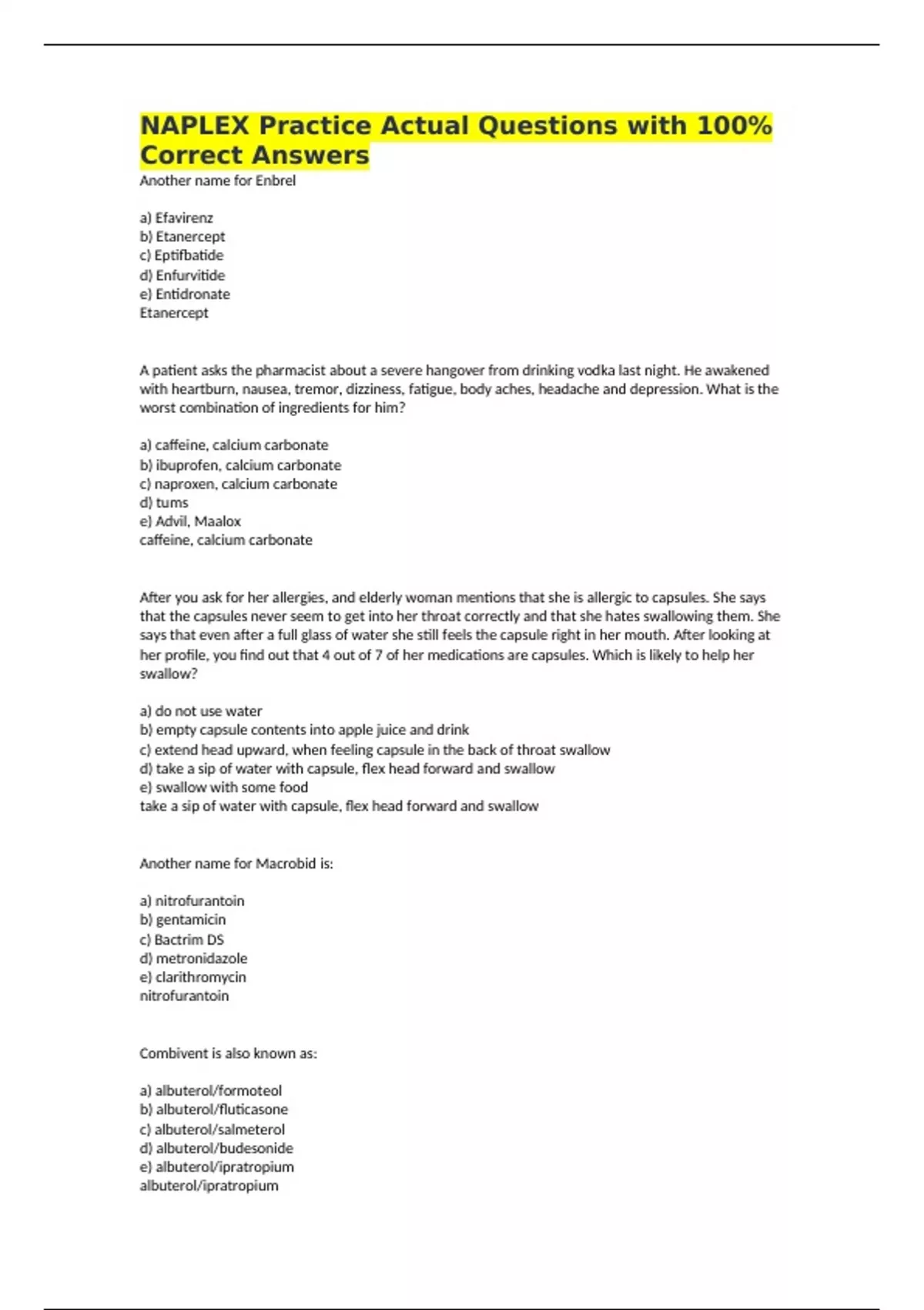 NAPLEX Practice Actual Questions with 100% Correct Answers Another name for Enbrel a) Efavirenz b) Etanercept c) Eptifbatide d) Enfurvitide e) Entidronate Etanercept A patient asks the pharmacist about a severe hangover from drinking vodka last night. He awakened with heartburn, nausea, tremor, dizziness, fatigue, body aches, headache and depression. What is the worst combination of ingredients for him? a) caffeine, calcium carbonate b) ibuprofen, calcium carbonate c) naproxen, calcium carbonate d) tums e) Advil, Maalox caffeine, calcium carbonate After you ask for her allergies, and elderly woman mentions that she is allergic to capsules. She says that the capsules never seem to get into her throat correctly and that she hates swallowing them. She says that even after a full glass of water she still feels the capsule right in her mouth. After looking at her profile, you find out that 4 out of 7 of her medications are capsules. Which is likely to help her swallow? a) do not use water b) empty capsule contents into apple juice and drink c) extend head upward, when feeling capsule in the back of throat swallow d) take a sip of water with capsule, flex head forward and swallow e) swallow with some food take a sip of water with capsule, flex head forward and swallow Another name for Macrobid is: a) nitrofurantoin b) gentamicin c) Bactrim DS d) metronidazole e) clarithromycin nitrofurantoin Combivent is also known as: a) albuterol/formoteol b) albuterol/fluticasone c) albuterol/salmeterol d) albuterol/budesonide e) albuterol/ipratropium albuterol/ipratropium I pray that this combo helps you vent better (albuterol) Another name for Bactrim is: a) Bacitracin b) Baclofen c) sulfamethoxazole/trimethoprim d) piperacillin/tazobactam sulfamethoxazole/trimethoprim Many dosage forms and medication delivery methods are considered suitable for nonprescription use. However, some are not available for nonprescription products. Which of the following is not available on a nonprescription basis? a) inhalers b) suppositories c) enteric coated tablets d) injections e) powders for inhalation powders for inhalation Magnesium stearate is commonly used as what type of pharmaceutic ingredient in tablet preparation? a) lubricant b) disintegrant c) opaquant d) polishing agent e) glidant lubricant magnesium oil - oil - lubricant A 17 y/o sexually active gravid 0 para 0 presents with painful menstruation. This is accompanied by diarrhea, headache, nausea, and vomiting. She feels incapacitated for 48-72 hours during menstruation each period. She was tried on first line medication with side effects which she claims she could not tolerate. Doctor started her then on a combination oral contraceptive. What is one of the effects of this medication? a) osteoporosis b) gallstone formation c) vaginal dryness d) increased cholesterol levels e) blurry vision gallstone formation you have some gall to start combo contraceptive A patient appearing to be aged in his 40s asks the pharmacist about a product to help his insomnia. He has only had it for 1 nights, and thinks it may be caused by worrying over an upcoming CPA exam. It may also be caused by the fact that his enlarged prostate causes him to have to urinate several times a night. He takes glyburide for diabetes. What should the pharmacist tell him? a) insomnia for 1 night requires a physician appointment b) nonprescription insomnia products are contraindicated with prostate enlargement c) nonprescription product are not indicated for short-term insomnia d) nonprescription insomnia products are contraindicated in patients with diabetes e) nonprescription insomnia products interact with glyburide nonprescription insomnia products are contraindicated with prostate enlargement Which agent is available in a rectal formulation for relief of constipation? a) bisacodyl b) sorbitol c) lubiprostone d) methylcellulose e) docusate sodium bisacodyl fleet, dulcolax suppositories A 24 y/o woman is studying for final exams and wants to know what she can do about several small vesicles that have formed a crust on the upper margin of her lip. The lesions are painful and she would like to minimize discomfort for an upcoming job interview. What most likely most likely caused this infection? a) fungus b) virus c) bacterial d) candida c) parasite virus What is the appropriate needle gauge for a newly diagnosed diabetic patient requiring subcutaneous insulin? a) 25G, 1 inch b) 31G, 1 inch c) 33G, 5/6 inch d) 31G, 5/6 inch e) 25G, 5/6 inch 31G, 5/6 inch An 80 y/o patient comes to the pharmacy counter requesting assistance with choosing an appropriate medication to treat her cold symptoms. Her main symptom is nasal congestion. She is a routine customer in your pharmacy and is compliant with her blood pressure medications, glaucoma eye drops, and bisphosphonates for osteoporosis. Which would you recommend? a) oral loratadine b) nasal saline spray c) oxymetazoline nasal spray d) oral diphenhydramine e) oral pseudoephedrine