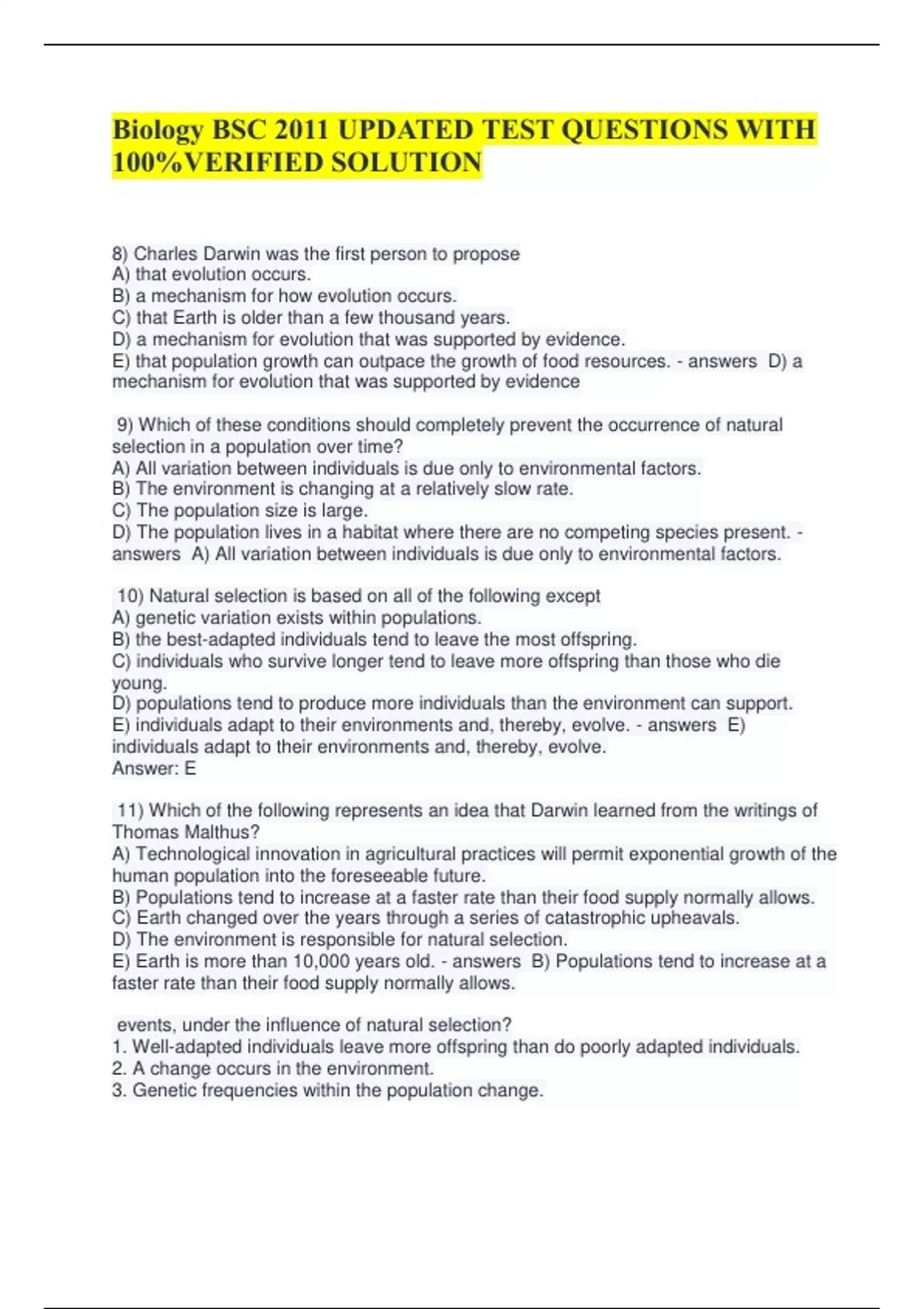 Biology BSC 2011 UPDATED TEST QUESTIONS WITH 100%VERIFIED SOLUTION 8) Charles Darwin was the first person to propose A) that evolution occurs. B) a mechanism for how evolution occurs. C) that Earth is older than a few thousand years. D) a mechanism for evolution that was supported by evidence. E) that population growth can outpace the growth of food resources. - answers D) a mechanism for evolution that was supported by evidence 9) Which of these conditions should completely prevent the occurrence of natural selection in a population over time? A) All variation between individuals is due only to environmental factors. B) The environment is changing at a relatively slow rate. C) The population size is large. D) The population lives in a habitat where there are no competing species present. - answers A) All variation between individuals is due only to environmental factors. 10) Natural selection is based on all of the following except A) genetic variation exists within populations. B) the best-adapted individuals tend to leave the most offspring. C) individuals who survive longer tend to leave more offspring than those who die young. D) populations tend to produce more individuals than the environment can support. E) individuals adapt to their environments and, thereby, evolve. - answers E) individuals adapt to their environments and, thereby, evolve. Answer: E 11) Which of the following represents an idea that Darwin learned from the writings of Thomas Malthus? A) Technological innovation in agricultural practices will permit exponential growth of the human population into the foreseeable future. B) Populations tend to increase at a faster rate than their food supply normally allows. C) Earth changed over the years through a series of catastrophic upheavals. D) The environment is responsible for natural selection. E) Earth is more than 10,000 years old. - answers B) Populations tend to increase at a faster rate than their food supply normally allows. events, under the influence of natural selection? 1. Well-adapted individuals leave more offspring than do poorly adapted individuals. 2. A change occurs in the environment. 3. Genetic frequencies within the population change. 4. Poorly adapted individuals have decreased survivorship. A) 2 → 4 → 1 → 3 B) 4 → 2 → 1 → 3 C) 4 → 1 → 2 → 3 D) 4 → 2 → 3 → 1 E) 2 → 4 → 3 → 1 - answers A) 2 → 4 → 1 → 3 13) A biologist studied a population of squirrels for 15 years. During that time, the population was never fewer than 30 squirrels and never more than 45. Her data showed that over half of the squirrels born did not survive to reproduce, because of both competition for food and predation. In a single generation, 90% of the squirrels that were born lived to reproduce, and the population increased to 80. Which inference(s) about this population might be true? A) The amount of available food may have increased. B) The parental generation of squirrels developed better eyesight due to improved diet; the subsequent squirrel generation inherited better eyesight. C) The squirrels of subsequent generations should show greater levels of genetic variation than previous generations, because squirrels that would not have survived in the past will now survive. D) Three of the statements above are correct. E) Two of the statements - answers E) Two of the statements above are correct. 14) Which of the following must exist in a population before natural selection can act upon that population? A) genetic variation among individuals B) variation among individuals caused by environmental factors C) sexual reproduction D) Three of the responses are correct. E) Two of the responses are correct. - answers A) genetic variation among individuals 15) Which of Darwin's ideas had the strongest connection to Darwin having read Malthus's essay on human population growth? A) descent with modification B) variation among individuals in a population C) struggle for existence D) the ability of related species to be conceptualized in "tree thinking" E) that the ancestors of the Galápagos finches had come from the South American mainland - answers C) struggle for existence 16) If Darwin had been aware of genes, and of their typical mode of transmission to subsequent generations, with which statement would he most likely have been in agreement? A) If natural selection can change one gene's frequency in a population over the course of generations then, given enough time and enough genes, natural selection can cause sufficient genetic change to produce new species from old ones. B) If an individual's somatic cell genes change during its lifetime, making it more fit, then it will be able to pass these genes on to its offspring. C) If an individual acquires new genes by engulfing, or being infected by, another organism, then a new genetic species will be the result. D) A single mutation in a single gene in a single gamete will, if perpetuated, produce a new species within just two generations. - answers A) If natural selection can change one gene's frequency in a population over the course of generations then, given enough time and enough genes, natural selection can cause sufficient genetic change to produce new species from old ones. 18) Currently, two extant elephant species (X and Y) are placed in the genus Loxodonta, and a third species (Z) is placed in the genus Elephas. Thus, which statement should be true? A) Species X and Y are not related to species Z. B) Species X and Y share a greater number of homologies with each other than either does with species Z. C) Species X and Y share a common ancestor that is still extant (in other words, not yet extinct). D) Species X and Y are the result of artificial selection from an ancestral species Z. E) Species X, Y, and Z share a common ancestor, but nothing more can be claimed than this. - answers B) Species X and Y share a greater number of homologies with each other than either does with species Z. 19) The