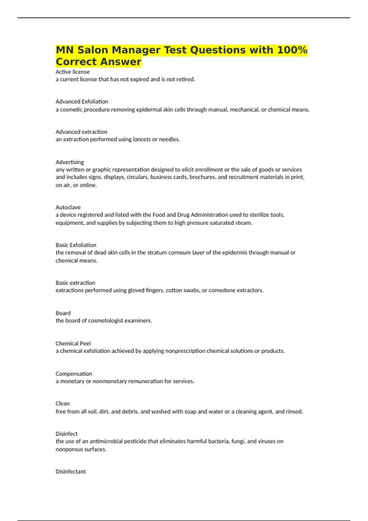 MN Salon Manager Test Questions with 100% Correct Answer Active license a current license that has not expired and is not retired. Advanced Exfoliation a cosmetic procedure removing epidermal skin cells through manual, mechanical, or chemical means. Advanced extraction an extraction performed using lancets or needles. Advertising any written or graphic representation designed to elicit enrollment or the sale of goods or services and includes signs, displays, circulars, business cards, brochures, and recruitment materials in print, on air, or online. Autoclave a device registered and listed with the Food and Drug Administration used to sterilize tools, equipment, and supplies by subjecting them to high pressure saturated steam. Basic Exfoliation the removal of dead skin cells in the stratum corneum layer of the epidermis through manual or chemical means. Basic extraction extractions performed using gloved fingers, cotton swabs, or comedone extractors. Board the board of cosmetologist examiners. Chemical Peel a chemical exfoliation achieved by applying nonprescription chemical solutions or products. Compensation a monetary or nonmonetary remuneration for services. Clean free from all soil, dirt, and debris, and washed with soap and water or a cleaning agent, and rinsed. Disinfect the use of an antimicrobial pesticide that eliminates harmful bacteria, fungi, and viruses on nonporous surfaces. Disinfectant an antimicrobial pesticide that is registered with the Environmental Protection Agency for use in a hospital setting and is bactericide, virucide, and fungicide. Electrical Energy Treatments advanced practice esthetic services for the cosmetic care of the skin that use electrical energy as applied by skin care equipment used on the epidermal layer. Electrical energy treatments use light, direct current, indirect current, or sound energy, but do not include laser as identified in Minnesota statures. Extraction means the cosmetic technique of removing impactions and comedones from follicles. Good Repair an item that is clean, with no holes, frayed wires, or tears in coverings, and fully operational for the purpose intended. Hazardous a hazardous substance or harmful physical agent. Homebound an individual lacks the physical or intellectual capacity for independent transportation and is unable to travel independently to a licensed salon. Licensed services those services defined as the practice of cosmetology. Lymphatic Drainage means a procedure using a light rhythmic pressure applied by manual or other means to the skin using specific lymphatic manipulations to promote drainage of the lymphatic fluid through the tissue. Microdermabrasion a cosmetic procedure using mechanical or manual means of light abrasion on the epidermal layer of the skin. Mobile Structure a trailer or other enclosed space towed by a vehicle. Nursing home a facility that is licensed and does not include any attached or adjacent facilities that are not licensed as a nursing home. Operator a standard license for practitioner and not a manager license. Physical Location the contiguous space representing each salon that can be accessed by customers without exiting the salon. Porous material a material that absorbs liquid or allows liquid to penetrate. Sharps any object, sterile, or contaminated, that may be purposefully or accidentally cut or penetrate the skin or mucosa including presterilized single-use lancets, dermal blades, and razor blades. Sharps Container a closed, puncture-resistant, leak-proof container, labeled with the international biohazard symbol, that is used for handling, storage, transportation, and disposal of sharps. Simple Braiding Devices include clips, combs, curlers, curling irons, hairpins, rollers, scissors, needles, and thread. Special event an event held for any purpose other than the provision of licensed services, where a participant in the event may receive the limited cosmetology services described. Sterilization the destruction of all microbial life and spores through the use of heat, steam, or chemical sterilants. Suite-style salon a business specializing in leasing or renting individual rooms or suites to licensees, where the salon license may be carried by the business or where each suite has its own salon license. Unregulated service those services not defined as the practice of cosmetology and are exempt from regulation by the board. Include ear piercing; body art; body painting; henna tattoos and permanent tattoos; eyebrow embroidery; eyebrow microblading; permanent hair removal; permanent makeup; tanning by UV radiation and spray tanning unit; injectables; services for theatrical, television, film, fashion, photography, or media productions or media appearances; mortuary services; massage; body wraps and lymphatic drainage when performed by a massage therapist; the practice of medicine; hair braiding; and threading. Work Area a space where regulated services are provided. A separate work area is created when the service is partitioned from other salon spaces or work areas by walls at least 6 feet high and doorways of less than 5 feet in width. Cosmetology the practice of personal services, for compensation, for the cosmetic care fo the hair, nails, and skin. These services include cleaning, conditioning, shaping, reinforcing, coloring, and enhancing the body surface areas of the head, scalp, face, arms, hands, feet, and trunk of the body, except where these services are performed by a barber. Cosmetologist any person who, for compensation, performs the personal services under cosmetology. Eyelash Extensions the application, removal, and trimming of threadlike natural or synthetic fibers to an eyelash, and includes the cleansing of the eye area and lashes. Eyelash extensions do not include color agents, straightening agents, permanent wave solutions, bleaching agents, applications to the eyebrow, or any other cosmetology service. Eyelash Technician any person who is not a cosmetologist,