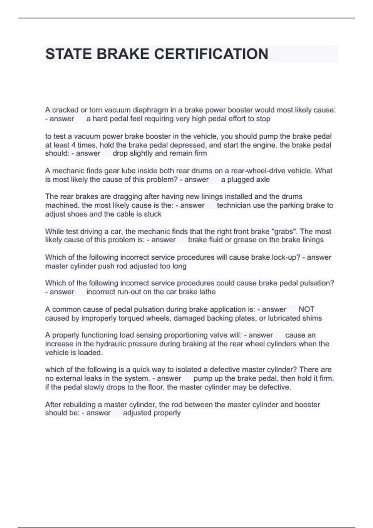 STATE BRAKE CERTIFICATION QUESTIONS AND ANSWERS GRADED A+