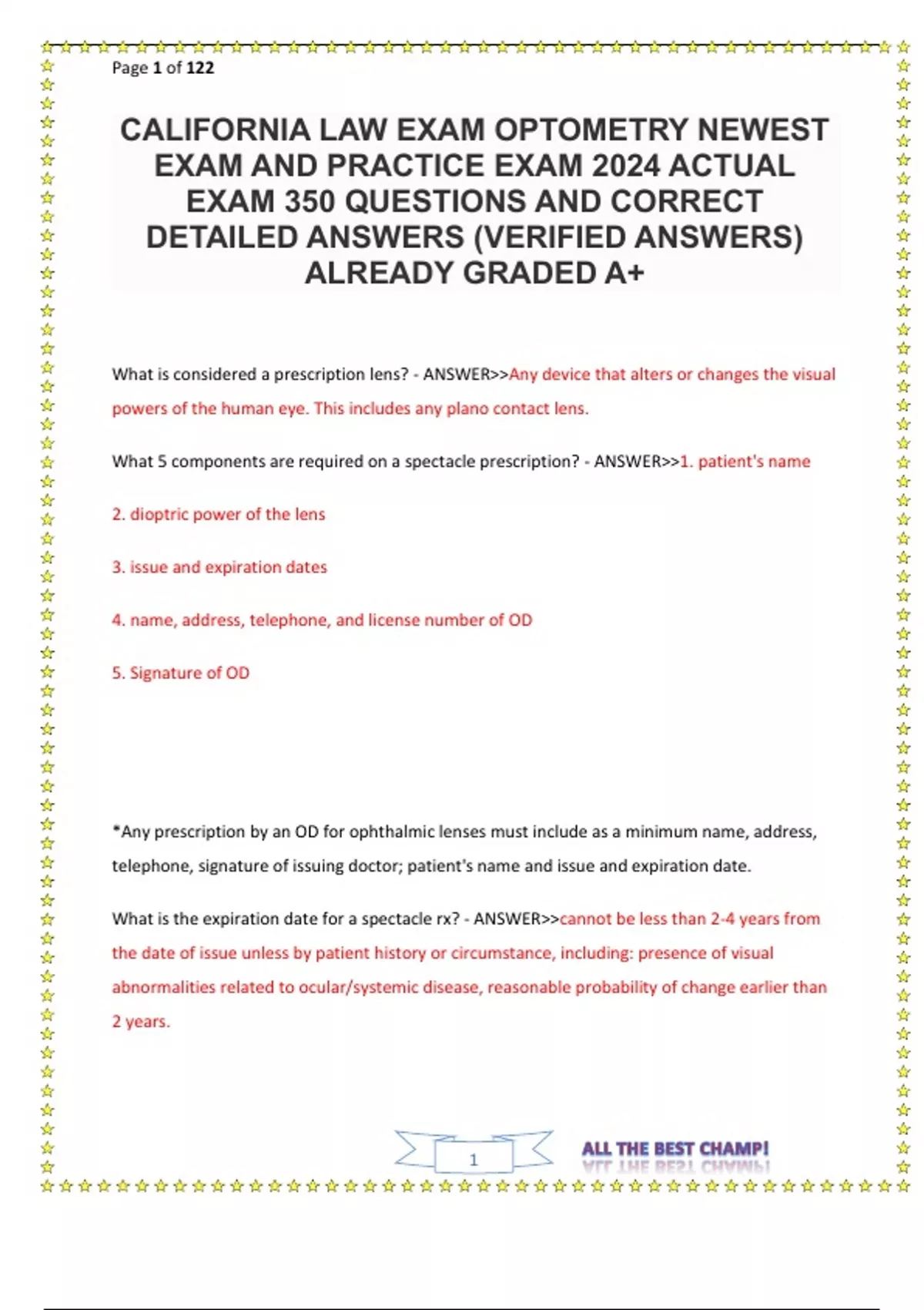 CALIFORNIA LAW EXAM OPTOMETRY NEWEST EXAM AND PRACTICE EXAM 2024 ACTUAL EXAM 350 QUESTIONS AND CORRECT DETAILED ANSWERS (VERIFIED ANSWERS) ALREADY GRADED A+