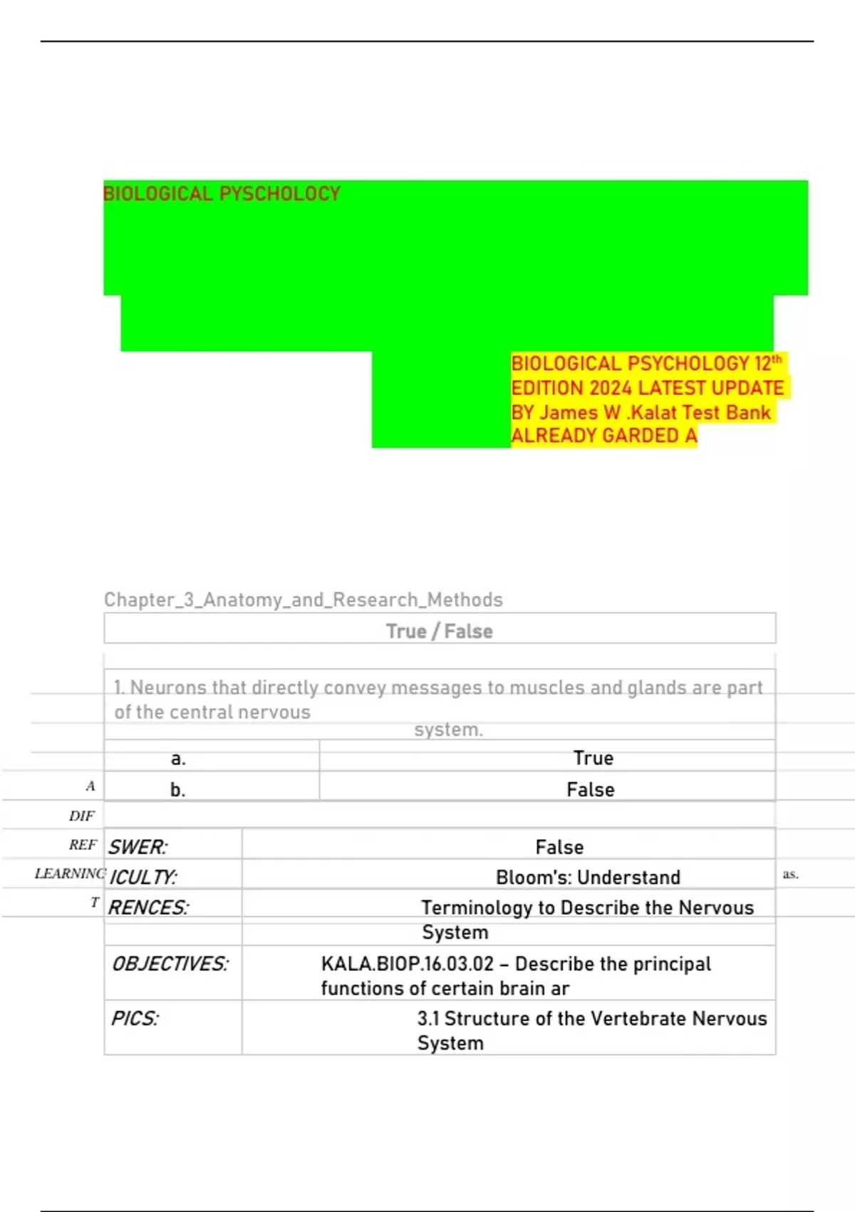 BIOLOGICAL PSYCHOLOGY 12th EDITION 2024 LATEST UPDATE BY James W .Kalat Test Bank ALREADY GARDED A Chapter_3_Anatomy_and_Research_Methods True / False 1. Neurons that directly convey messages to muscles and glands are part of the central nervous system. a. True b. False SWER: False ICULTY: Bloom’s: Understand RENCES: Terminology to Describe the Nervous System OBJECTIVES: KALA.BIOP.16.03.02 – Describe the principal functions of certain brain ar PICS: 3.1 Structure of the Vertebrate Nervous System A DIF RE LEARNIN T y. A DIF REF LEARNING T as. A DIF REF LEARNING T as. 2. The elbow is more distal to the shoulder than the hand. a. True b. False NSWER: False FICULTY: Bloom’s: Analyze ERENCES: Terminology to Describe the Nervous System G OBJECTIVES: KALA.BIOP.16.03.01 – Define the terms used to describe brain anatom OPICS: 3.1 Structure of the Vertebrate Nervous System 3. Cell bodies of motor neurons are located outside of the spinal cord. a. True b. False SWER: False ICULTY: Bloom’s: Understand RENCES: The Spinal Cord OBJECTIVES: KALA.BIOP.16.03.02 – Describe the principal functions of certain brain ar PICS: 3.1 Structure of the Vertebrate Nervous System 4. The parasympathetic nervous system activates the “fight or flight” response. a. True b. False SWER: False ICULTY: Bloom’s: Understand RENCES: The Autonomic Nervous System OBJECTIVES: KALA.BIOP.16.03.02 – Describe the principal functions of certain brain ar PICS: 3.1 Structure of the Vertebrate Nervous System 5. Parasympathetic neurons use acetylcholine as their neurotransmitter. a. True b. False A DIF REF LEARNING T as. A DIF REF LEARNING T as. A DIF REF LEARNING T as. A DIF SWER: True ICULTY: Bloom’s: Understand RENCES: The Autonomic Nervous System OBJECTIVES: KALA.BIOP.16.03.02 – Describe the principal functions of certain brain ar PICS: 3.1 Structure of the Vertebrate Nervous System 6. The hindbrain consists of the medulla, the pons, and the cerebellum. a. True b. False SWER: True ICULTY: Bloom’s: Understand RENCES: The Hindbrain OBJECTIVES: KALA.BIOP.16.03.02 – Describe the principal functions of certain brain ar PICS: 3.1 Structure of the Vertebrate Nervous System 7. Some cranial nerves include both sensory and motor components. a. True b. False SWER: True ICULTY: Bloom’s: Understand RENCES: The Hindbrain OBJECTIVES: KALA.BIOP.16.03.02 – Describe the principal functions of certain brain ar PICS: 3.1 Structure of the Vertebrate Nervous System 8. Substantia nigra gives rise to the dopamine-containing pathway that facilitates readiness for movement. a. True b. False SWER: True ICULTY: Bloom’s: Understand