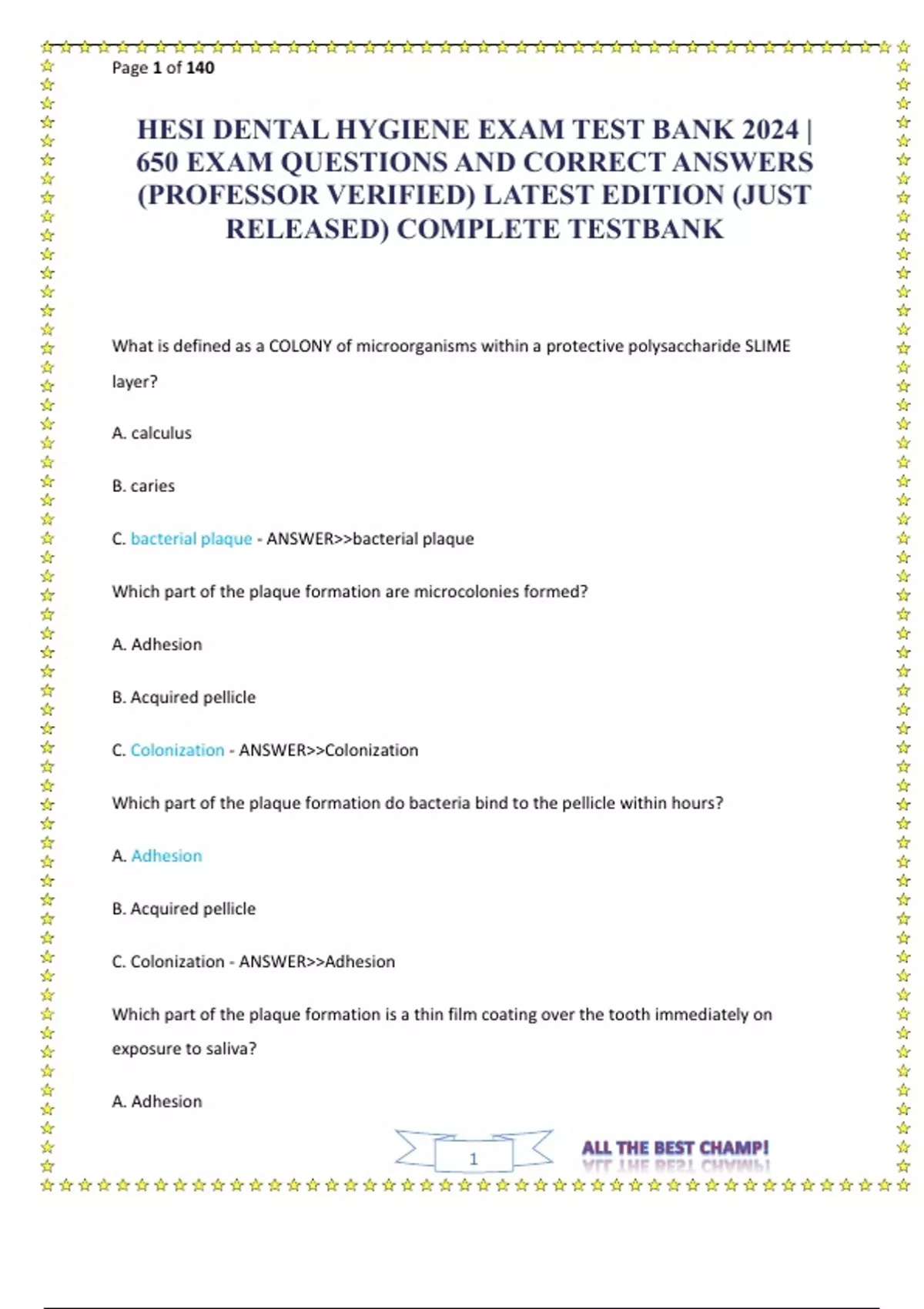 HESI DENTAL HYGIENE EXAM TEST BANK 2024-650 EXAM QUESTIONS AND CORRECT ANSWERS (PROFESSOR VERIFIED) LATEST EDITION (JUST RELEASED) COMPLETE TESTBANK.