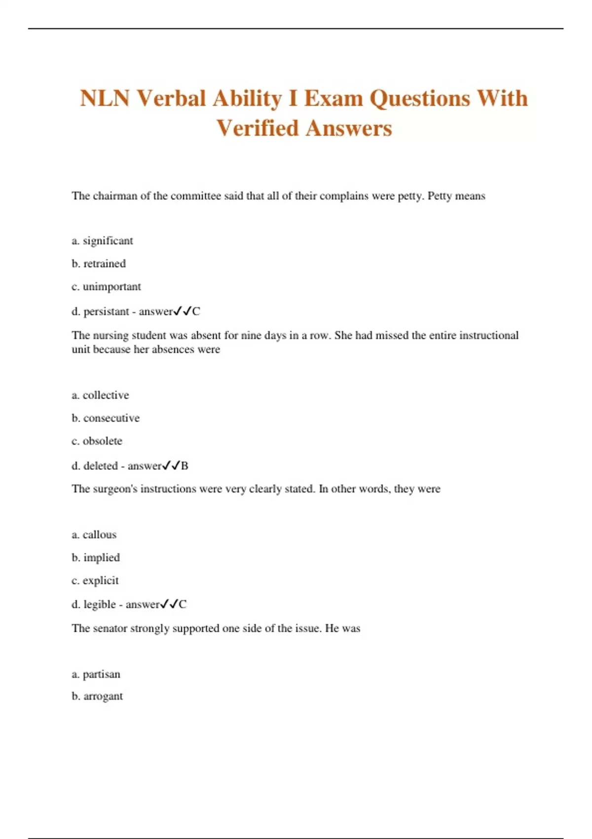 NLN Verbal Ability I Exam Questions With Verified Answers