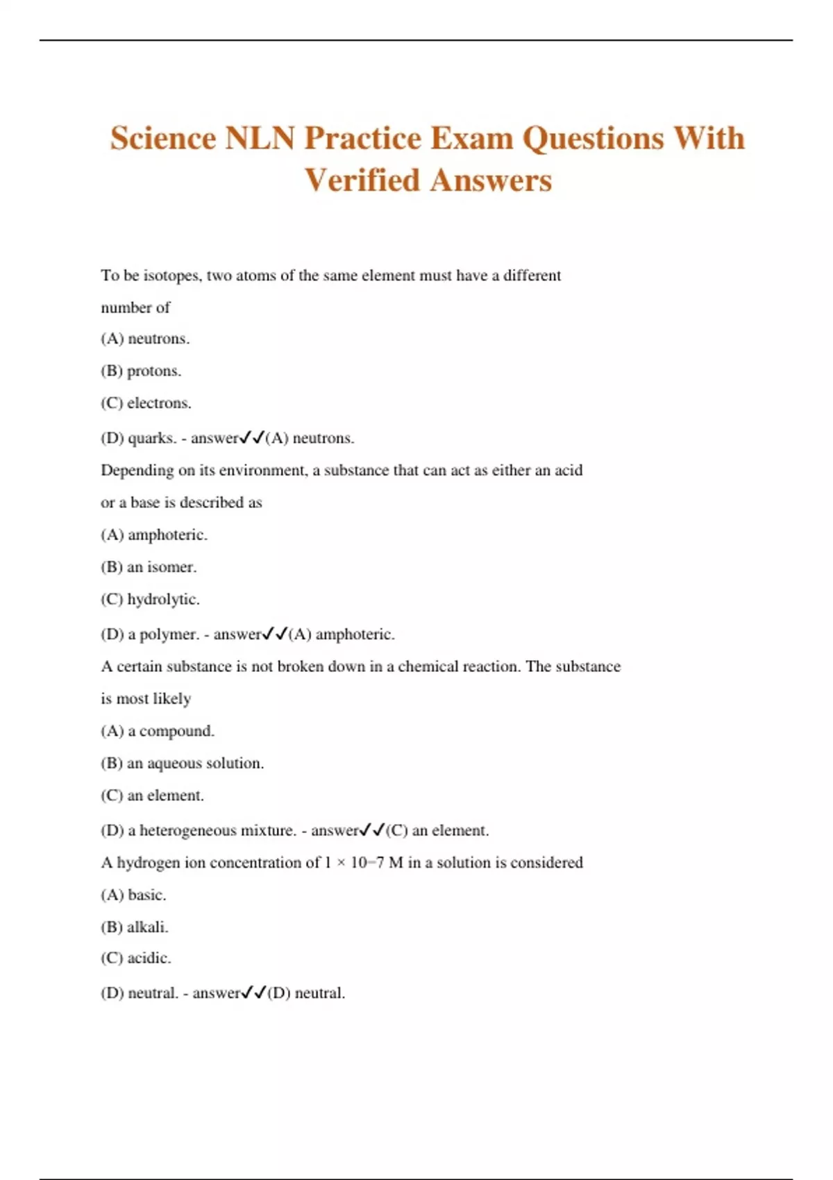 Science NLN Practice Exam Questions With Verified Answers To be isotopes, two atoms of the same element must have a different number of (A) neutrons. (B) protons. (C) electrons. (D) quarks. - answer(A) neutrons. Depending on its environment, a substance that can act as either an acid or a base is described as (A) amphoteric. (B) an isomer. (C) hydrolytic. (D) a polymer. - answer(A) amphoteric. A certain substance is not broken down in a chemical reaction. The substance is most likely (A) a compound. (B) an aqueous solution. (C) an element. (D) a heterogeneous mixture. - answer(C) an element. A hydrogen ion concentration of 1 × 10−7 M in a solution is considered (A) basic. (B) alkali. (C) acidic. (D) neutral. - answer(D) neutral. The radioactive isotope I-131 has a half-life of 8 days. What fraction of a sample of I-131 will remain after 24 days? (A) 1⁄4 (B) 1⁄16 (C) 1⁄8 (D) 1⁄2 - answer(C) 1⁄8 Which of the following particles/rays is not a type of radioactive emanation? (A) alpha particle (B) beta particle (C) gamma ray (D) carbon-12 - answer(D) carbon-12 The strongest acid can be found in which of the following pH ranges? (A) 11.1−12 (B) 7.1−8.2 (C) 4.5−5.7 (D) 1.0−2.0 - answer(D) 1.0−2.0 The symbol K on the periodic table stands for (A) potassium. (B) calcium. (C) carbon. (D) phosphorus. - answer(A) potassium. Which of the following reactions releases heat energy? (A) double replacement (B) decomposition (C) endothermic (D) exothermic - answer(D) exothermic Which gas law states that the volume of a gas is inversely proportional to the pressure?