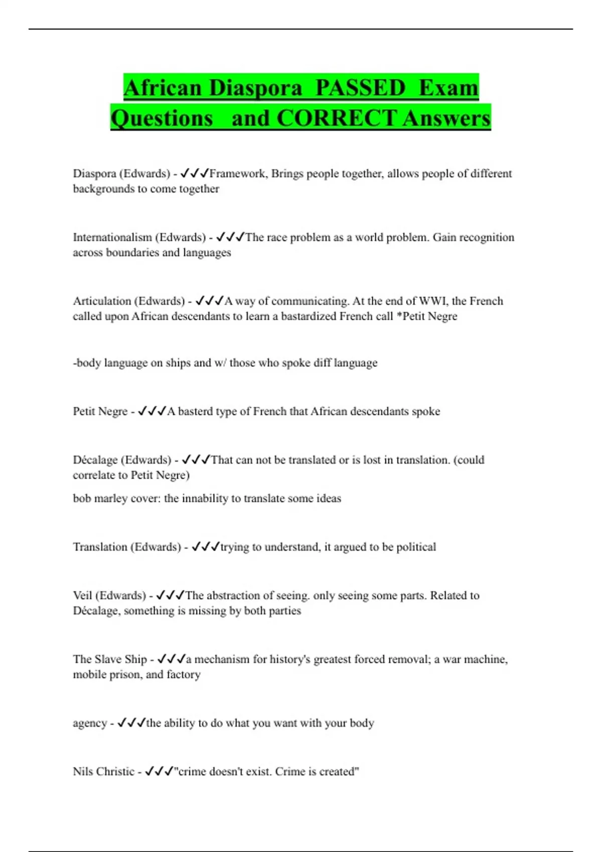 African Diaspora PASSED Exam Questions and CORRECT Answers