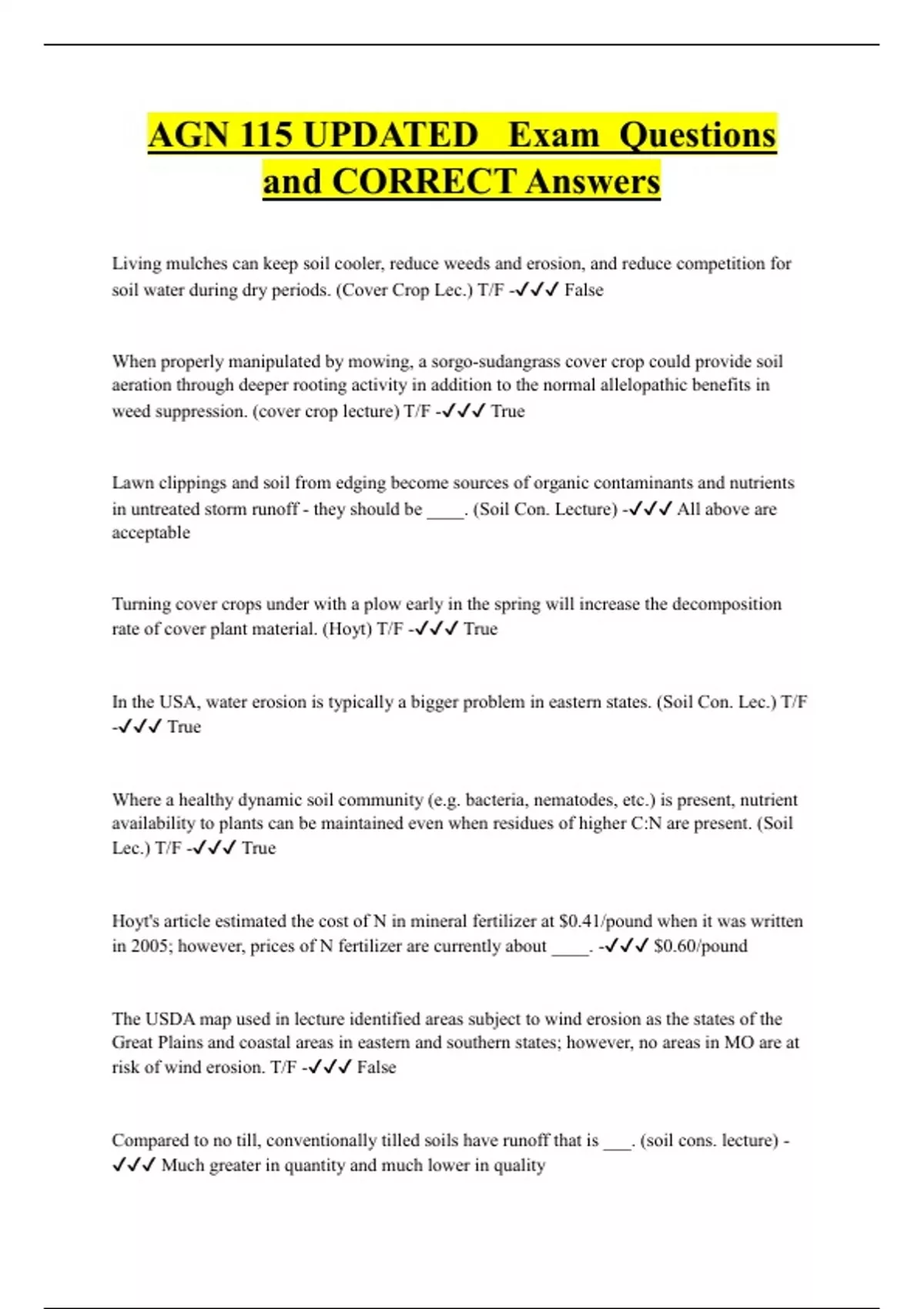 Living mulches can keep soil cooler, reduce weeds and erosion, and reduce competition for soil water during dry periods. (Cover Crop Lec.) T/F - False When properly manipulated by mowing, a sorgo-sudangrass cover crop could provide soil aeration through deeper rooting activity in addition to the normal allelopathic benefits in weed suppression. (cover crop lecture) T/F - True Lawn clippings and soil from edging become sources of organic contaminants and nutrients in untreated storm runoff - they should be ____. (Soil Con. Lecture) - All above are acceptable Turning cover crops under with a plow early in the spring will increase the decomposition rate of cover plant material. (Hoyt) T/F - True In the USA, water erosion is typically a bigger problem in eastern states. (Soil Con. Lec.) T/F - True