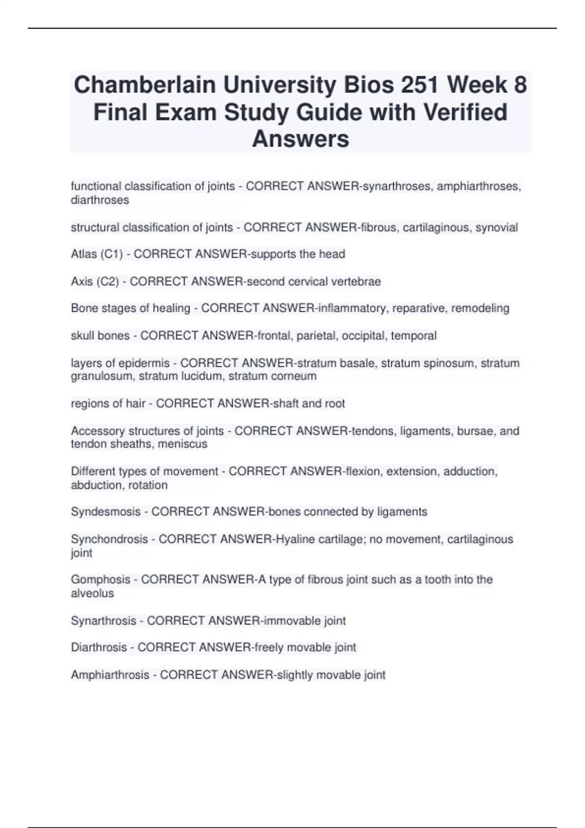 Chamberlain University Bios 251 Week 8 Final Exam Study Guide with Verified Answers functional classification of joints - CORRECT ANSWER-synarthroses, amphiarthroses, diarthroses structural classification of joints - CORRECT ANSWER-fibrous, cartilaginous, synovial Atlas (C1) - CORRECT ANSWER-supports the head Axis (C2) - CORRECT ANSWER-second cervical vertebrae Bone stages of healing - CORRECT ANSWER-inflammatory, reparative, remodeling skull bones - CORRECT ANSWER-frontal, parietal, occipital, temporal layers of epidermis - CORRECT ANSWER-stratum basale, stratum spinosum, stratum granulosum, stratum lucidum, stratum corneum regions of hair - CORRECT ANSWER-shaft and root Accessory structures of joints - CORRECT ANSWER-tendons, ligaments, bursae, and tendon sheaths, meniscus Different types of movement - CORRECT ANSWER-flexion, extension, adduction, abduction, rotation Syndesmosis - CORRECT ANSWER-bones connected by ligaments Synchondrosis - CORRECT ANSWER-Hyaline cartilage; no movement, cartilaginous joint Gomphosis - CORRECT ANSWER-A type of fibrous joint such as a tooth into the alveolus Synarthrosis - CORRECT ANSWER-immovable joint Diarthrosis - CORRECT ANSWER-freely mo