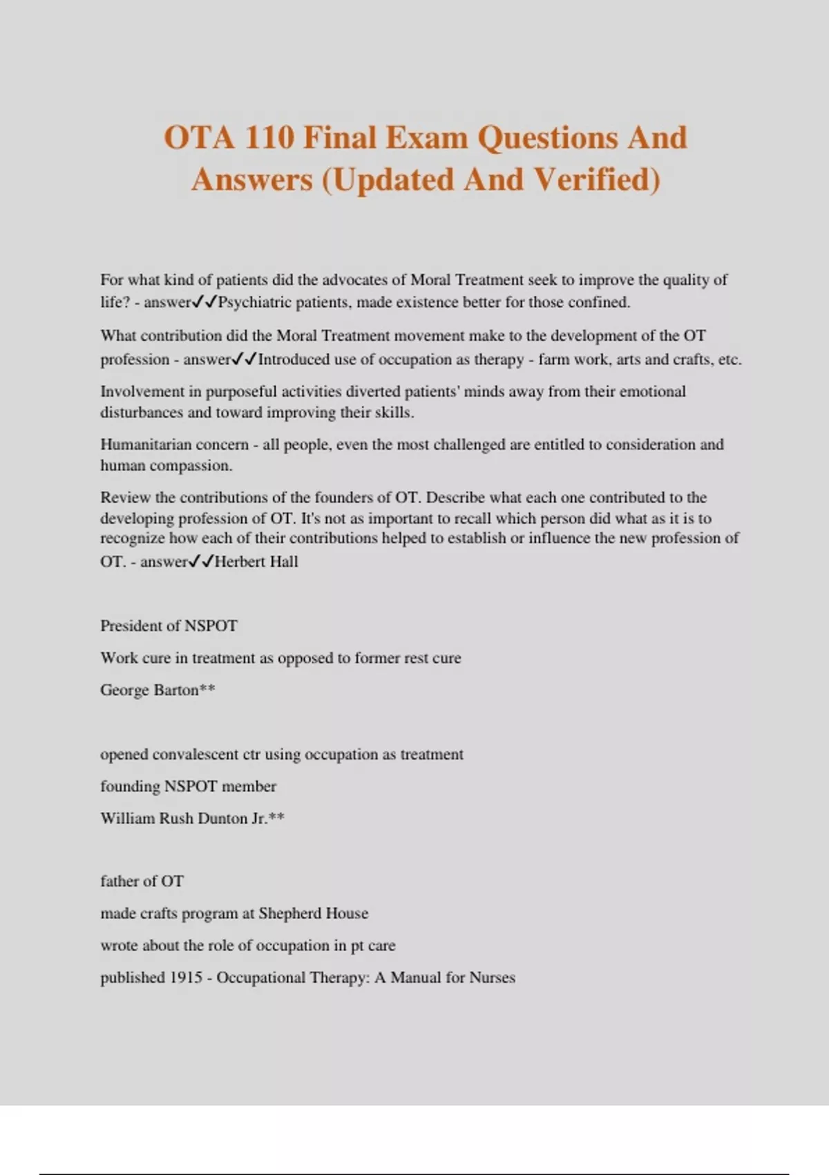 OTA 110 Final Exam Questions And Answers (Updated And Verified) For what kind of patients did the advocates of Moral Treatment seek to improve the quality of life? - answerPsychiatric patients, made existence better for those confined. What contribution did the Moral Treatment movement make to the development of the OT profession - answerIntroduced use of occupation as therapy - farm work, arts and crafts, etc. Involvement in purposeful activities diverted patients' minds away from their emotional disturbances and toward improving their skills. Humanitarian concern - all people, even the most challenged are entitled to consideration and human compassion. Review the contributions of the founders of OT. Describe what each one contributed to the developing profession of OT. It's not as important to recall which person did what as it is to recognize how each of their contributions helped to establish or influence the new profession of OT. - answerHerbert Hall President of NSPOT Work cure in treatment as opposed to former rest cure George Barton** opened convalescent ctr using occupation as treatment founding NSPOT member William Rush Dunton Jr.** father of OT made crafts program at Shepherd House wrote about the role of occupation in pt care published 1915 - Occupational Therapy: A Manual for Nurses Eleanor Clarke Slage** Mother of OT social worker used habit training Susan Tracy (RN) wrote textbooks for nurses - Studies on Invalid Occupations believed nurses best suited for OT Susan Cox Johnson, teacher** advocated high standards in education believed in morally uplifting treatments Thomas Kidner, architect** worked w/ WWI vets influential in establishing OT in vocational rehab programs promote movement to hospitalize individuals with TB Adolf Meyer, psychiatrist involvement in meaningful activity is part of being human advocated for holism Purposeful activity promotes health "Philosophy of Occupational Therapy" - later published in first journal (keynote address) **denotes original group in 1917 What is holism and how did it influence the developing practice of OT - answerHolism involves treating the patient as a whole rather than as their disability OT believes in engaging the person's body and mind using occupations that are meaningful to them