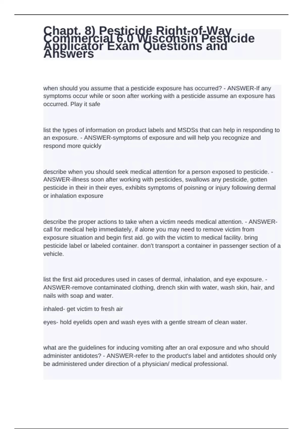 when should you assume that a pesticide exposure has occurred? - ANSWER-If any symptoms occur while or soon after working with a pesticide assume an exposure has occurred. Play it safe list the types of information on product labels and MSDSs that can help in responding to an exposure. - ANSWER-symptoms of exposure and will help you recognize and respond more quickly describe when you should seek medical attention for a person exposed to pesticide. - ANSWER-illness soon after working with pesticides, swallows any pesticide, gotten pesticide in their in their eyes, exhibits symptoms of poisning or injury following dermal or inhalation exposure describe the proper actions to take when a victim needs medical attention. - ANSWER-call for medical help immediately, if alone you may need to remove victim from exposure situation and begin first aid. go with the victim to medical facility. bring pesticide label or labeled container. don't transport a container in passenger section of a vehicle. list the first aid procedures used in cases of dermal, inhalation, and eye exposure. - ANSWER-remove contaminated clothing, drench skin with water, wash skin, hair, and nails with soap and water. inhaled- get victim to fresh air eyes- hold eyelids open and wash eyes with a gentle stream of clean water. what are the guidelines for inducing vomiting after an oral exposure and who should administer antidotes? - ANSWER-refer to the product's label and antidotes should only be administered under direction of a physician/ medical professional. how do you recognize and respond to shock? - ANSWER-skin will be pale, moist cold, and clammy. eyes will be vacant and lackluster with dilated pupils. Breathing slow/irregular, pulse is weak, rapid, irregular, may be unconscious. keep victim flat on back and elevate legs above head unless vomiting, keep victim warm, keep victim quiet, give reassurance, never give anything by mouth to unconscious victim.