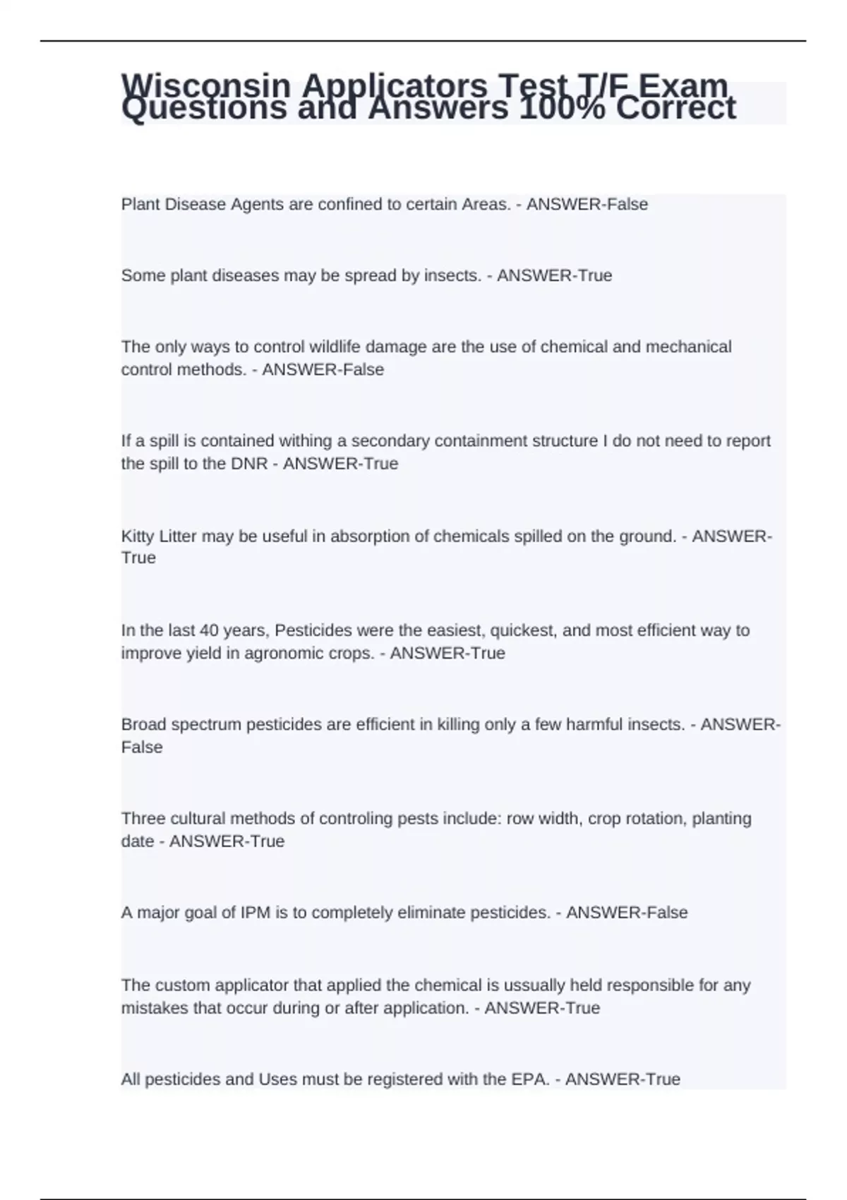 Wisconsin Applicators Test T/F Exam Questions and Answers 100% Correct