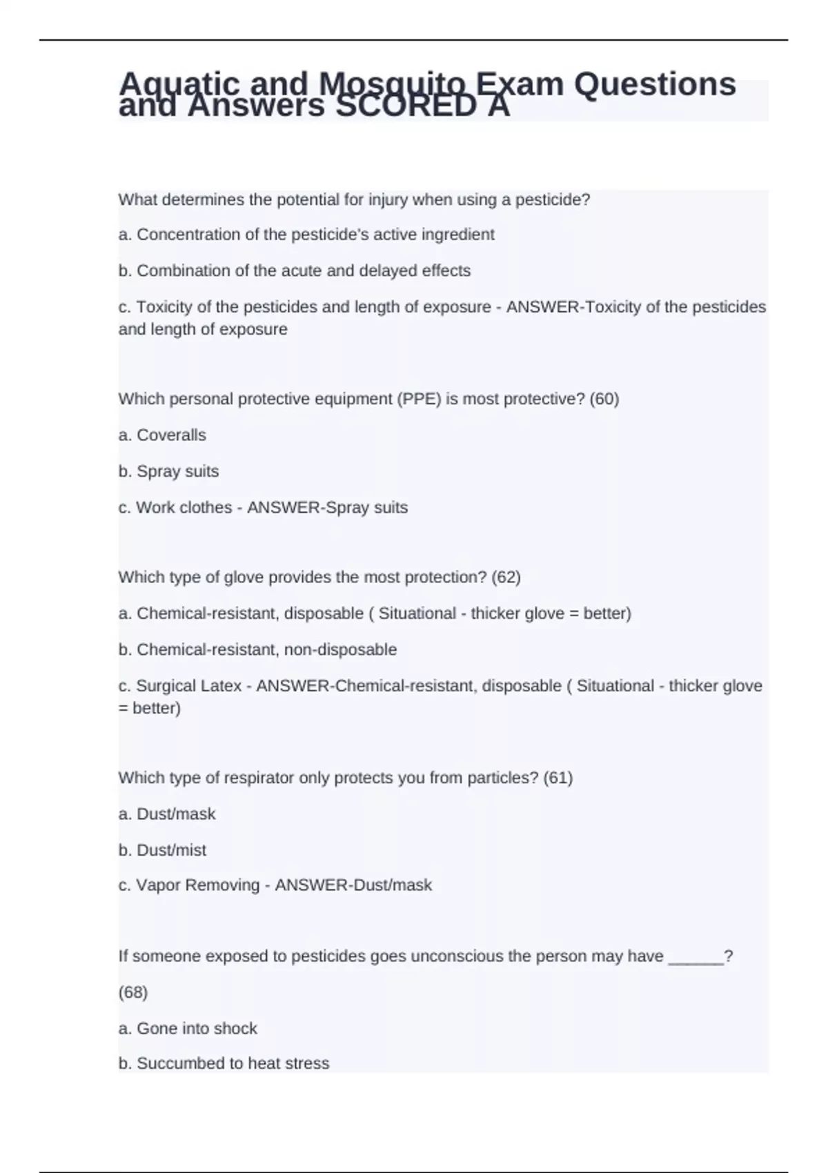 What determines the potential for injury when using a pesticide? a. Concentration of the pesticide's active ingredient b. Combination of the acute and delayed effects c. Toxicity of the pesticides and length of exposure - ANSWER-Toxicity of the pesticides and length of exposure Which personal protective equipment (PPE) is most protective? (60) a. Coveralls b. Spray suits c. Work clothes - ANSWER-Spray suits Which type of glove provides the most protection? (62) a. Chemical-resistant, disposable ( Situational - thicker glove = better) b. Chemical-resistant, non-disposable c. Surgical Latex - ANSWER-Chemical-resistant, disposable ( Situational - thicker glove = better) Which type of respirator only protects you from particles? (61) a. Dust/mask b. Dust/mist c. Vapor Removing - ANSWER-Dust/mask If someone exposed to pesticides goes unconscious the person may have ______? (68) a. Gone into shock b. Succumbed to heat stress c. Had a stroke - ANSWER-Gone into shock If pesticide gets on your skin, you should ______? (67) a. Drench skin with water b. Apply ointment to the affected skin c. Loosen all tight clothing - ANSWER-Drench skin with water What document should you give to a physician responding to a pesticide emergency? (45) a. Manufacturer labeling form b. USDA Safety Sheet c. Pesticide Label - ANSWER-Pesticide Label