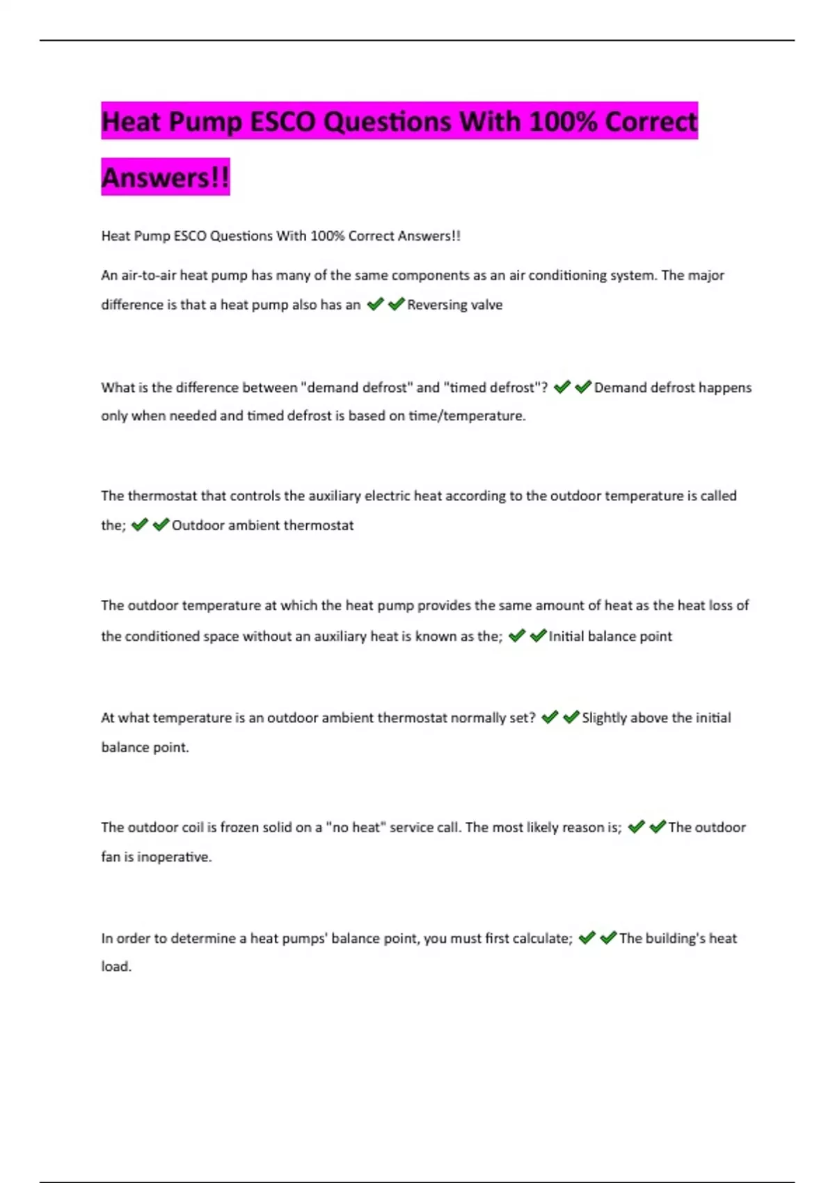 Heat Pump ESCO Questions With 100% Correct Answers!! An air-to-air heat pump has many of the same components as an air conditioning system. The major difference is that a heat pump also has an Reversing valve What is the difference between "demand defrost" and "timed defrost"? Demand defrost happens only when needed and timed defrost is based on time/temperature. The thermostat that controls the auxiliary electric heat according to the outdoor temperature is called the; Outdoor ambient thermostat The outdoor temperature at which the heat pump provides the same amount of heat as the heat loss of the conditioned space without an auxiliary heat is known as the; Initial balance point At what temperature is an outdoor ambient thermostat normally set? Slightly above the initial balance point. The outdoor coil is frozen solid on a "no heat" service call. The most likely reason is; The outdoor fan is inoperative. In order to determine a heat pumps' balance point, you must first calculate; The building's heat load