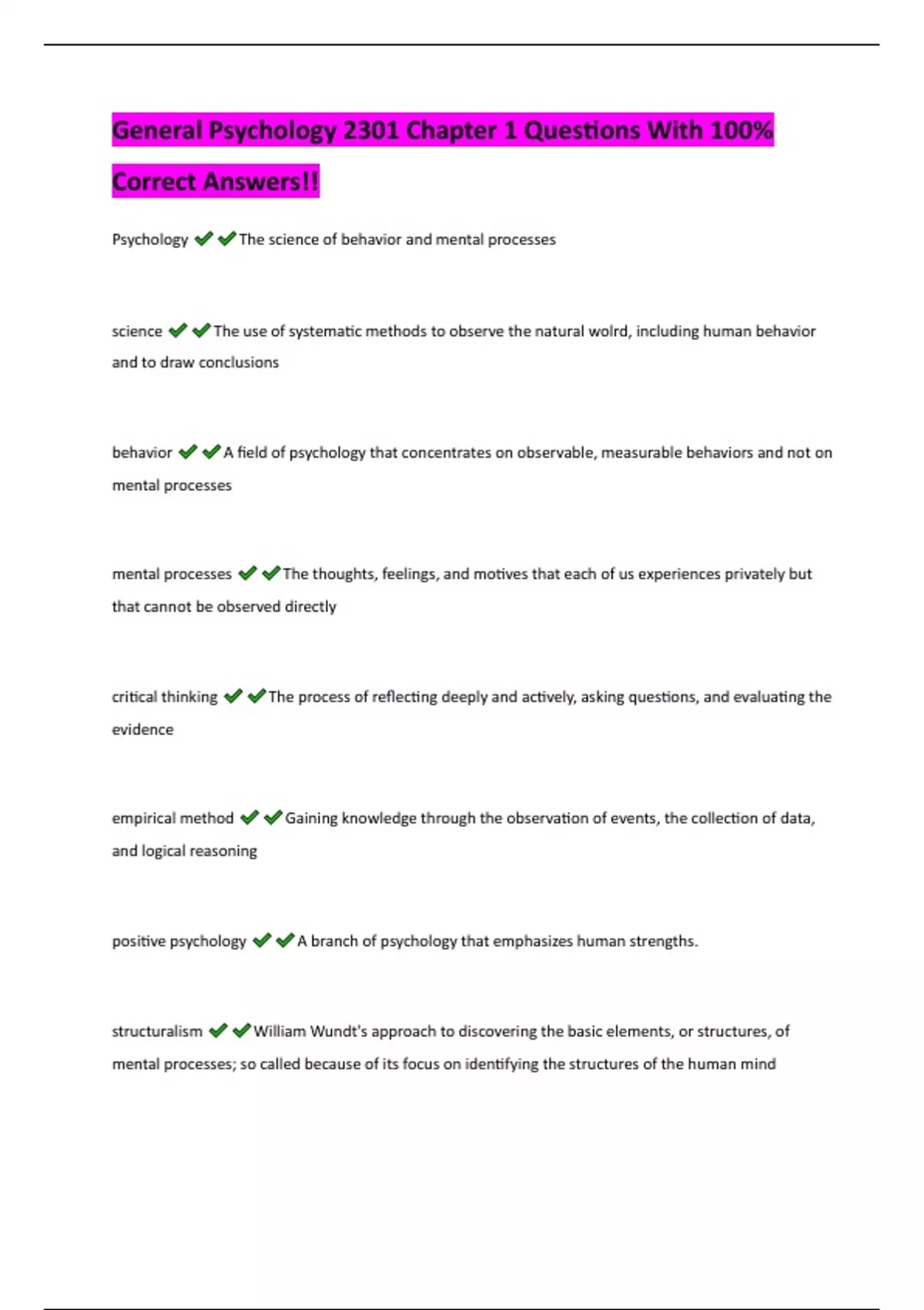 General Psychology 2301 Chapter 1 Questions With 100% Correct Answers!!