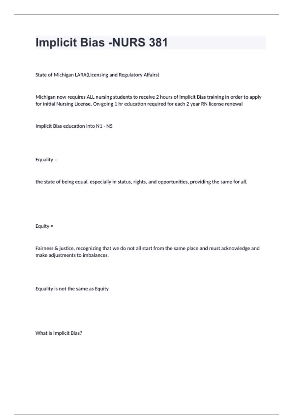 Implicit Bias -NURS 381 questions with correct answers rated A+