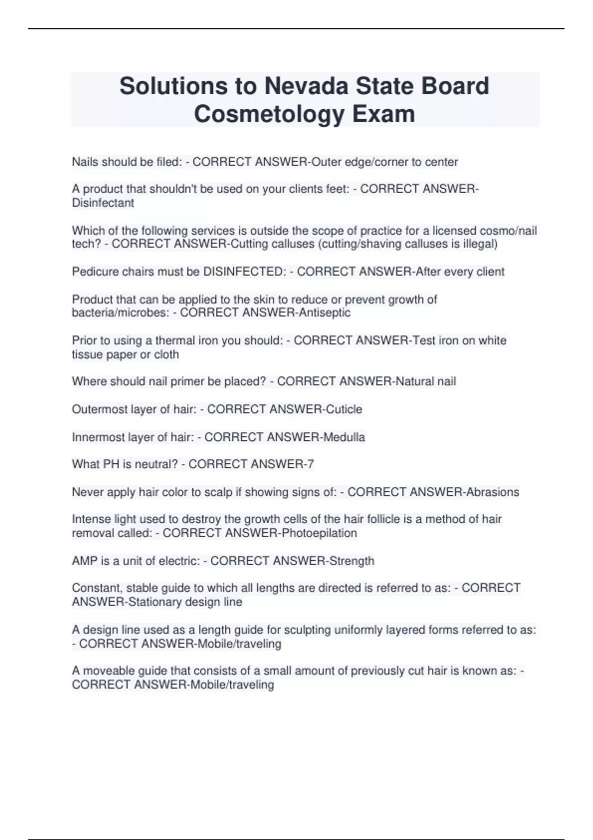 Solutions to Nevada State Board Cosmetology Exam Nails should be filed: - CORRECT ANSWER-Outer edge/corner to center A product that shouldn't be used on your clients feet: - CORRECT ANSWERDisinfectant Which of the following services is outside the scope of practice for a licensed cosmo/nail tech? - CORRECT ANSWER-Cutting calluses (cutting/shaving calluses is illegal) Pedicure chairs must be DISINFECTED: - CORRECT ANSWER-After every client Product that can be applied to the skin to reduce or prevent growth of bacteria/microbes: - CORRECT ANSWER-Antiseptic Prior to using a thermal iron you should: - CORRECT ANSWER-Test iron on white tissue paper or cloth Where should nail primer be placed? - CORRECT ANSWER-Natural nail Outermost layer of hair: - CORRECT ANSWER-Cuticle Innermost layer of hair: - CORRECT ANSWER-Medulla What PH is neutral? - CORRECT ANSWER-7 Never apply hair color to scalp if showing signs of: - CORRECT ANSWER-Abrasions Intense light used to destroy the growth cells of the hair follicle is a method of hair removal called: - CORRECT ANSWER-Photoepilation AMP is a unit of electric: - CORRECT ANSWER-Strength Constant, stable guide to which all lengths are directed is referred to as: - CORRECT ANSWER-Stationary design line A design line used as a length guide for sculpting uniformly layered forms referred to as: - CORRECT ANSWER-Mobile/traveling A moveable guide that consists of a small amount of previously cut hair is known as: - CORRECT ANSWER-Mobile/traveling Hair Pressing: - CORRECT ANSWER-Silking Dart alterations of a wig are made vertically to: - CORRECT ANSWER-Remove width in the nape area The purpose of neutralizer is to stop p