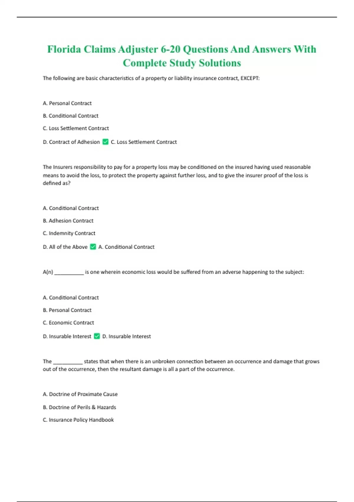 Florida Claims Adjuster 6-20 Questions And Answers With Complete Study Solutions Florida Claims Adjuster 6-20 Questions And Answers With Complete Study Solutions