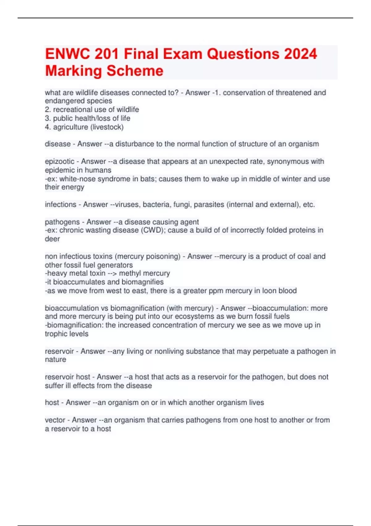 ENWC 201 Final Exam Questions 2024 Marking Scheme what are wildlife diseases connected to? - Answer -1. conservation of threatened and endangered species 2. recreational use of wildlife 3. public health/loss of life 4. agriculture (livestock) disease - Answer --a disturbance to the normal function of structure of an organism epizootic - Answer --a disease that appears at an unexpected rate, synonymous with epidemic in humans -ex: white-nose syndrome in bats; causes them to wake up in middle of winter and use their energy infections - Answer --viruses, bacteria, fungi, parasites (internal and external), etc. pathogens - Answer --a disease causing agent -ex: chronic wasting disease (CWD); cause a build of of incorrectly folded proteins in deer non infectious toxins (mercury poisoning) - Answer --mercury is a product of coal and other fossil fuel generators -heavy metal toxin -- methyl mercury -it bioaccumulates and biomagnifies -as we move from west to east, there is a greater ppm mercury in loon blood bioaccumulation vs biomagnification (with mercury) - Answer --bioaccumulation: more and more mercury is being put into our ecosystems as we burn fossil fuels -biomagnification: the increased concentration of mercury we see as we move up in trophic levels reservoir - Answer --any living or nonliving substance that may perpetuate a pathogen in nature reservoir host - Answer --a host that acts as a reservoir for the pathogen, but does not suffer ill effects from the disease host - Answer --an organism on or in which another organism lives vector - Answer --an organism that carries pathogens from one host to another or from a reservoir to a host biological vector vs mechanical vector - Answer --biological vector: has the pathogen inside its own body and regurgitates it to another host (mosquito) -mechanical vector: carries the pathogen around on the outside (fly) avian botulism type E - Answer --quaqqa and zebra mussels increase the clarity of the water -algae beds grow because of the increased sunlight but are a host of avian botulism type E -invasive round goby fish pick up the avian botulism type E and loons eat these fish -over 1,000 loons killed on one lake serengeti lions and disease - Answer --lack of healthcare for pet dogs here -jackals get the canine distemper/rabies from the dogs and pass it to lions -serious threat to lion population bison in yellowstone - Answer --known to carry brucellosis which can transfer to cows -cows with this abort their fetuses so farmers can't sell as much meat why are we seeing the emergence of so many diseases? (sea otter example) - Answer --more people -- less habitat available -- more stress of animals -- more human/wildlife interactions -last 2 lead to an increase in diseases -ex: high stress in sea otters when oil spills occur; oil removes air pockets that otters rely on for insulation; humans have to catch them to clean them; after this, they become more susceptible to the impact of a latent herpes strain zoonosis - Answer --an animal disease that can be transmitted to humans, but we are not necessary in the cycle lyme disease - Answer --cause: bacteria -transmission: deer tick and lone-star tick -symptoms: rash, fever, swollen lymph nodes -if left untreated, further complications may arise such as meningitis, facial palsy, heart abnormalities, and arthritis west nile virus - Answer --cause: virus -transmission: Culex mosquito -most people do not develop any type of illness -about 1 in 5 develop west nile fever -about 1 in 150 develop a severe infection -no specific treatment is available