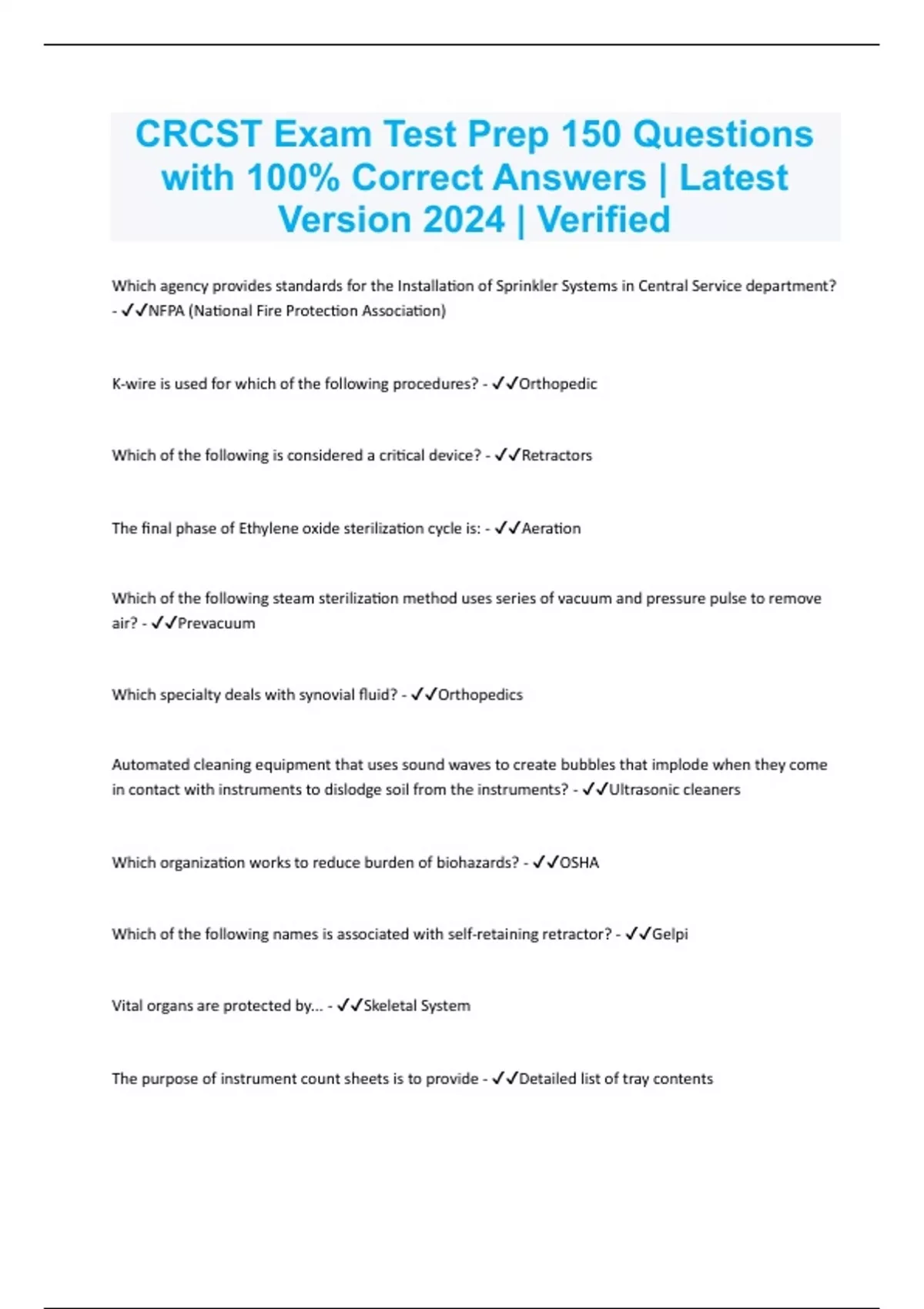 CRCST Exam Test Prep 150 Questions with 100% Correct Answers | Latest Version 2024 | Verified