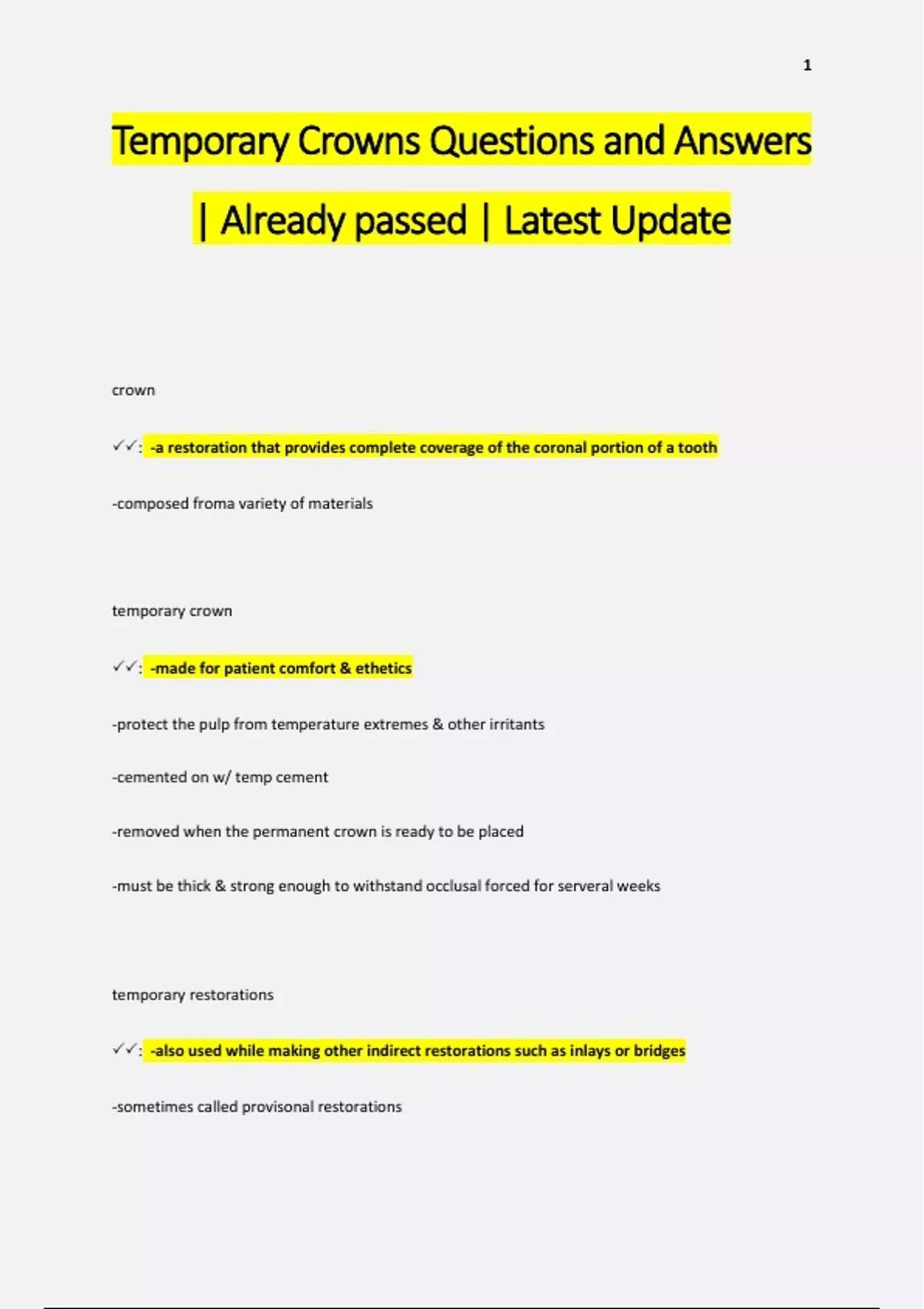 Temporary Crowns Questions and Answers | Already passed | Latest Update