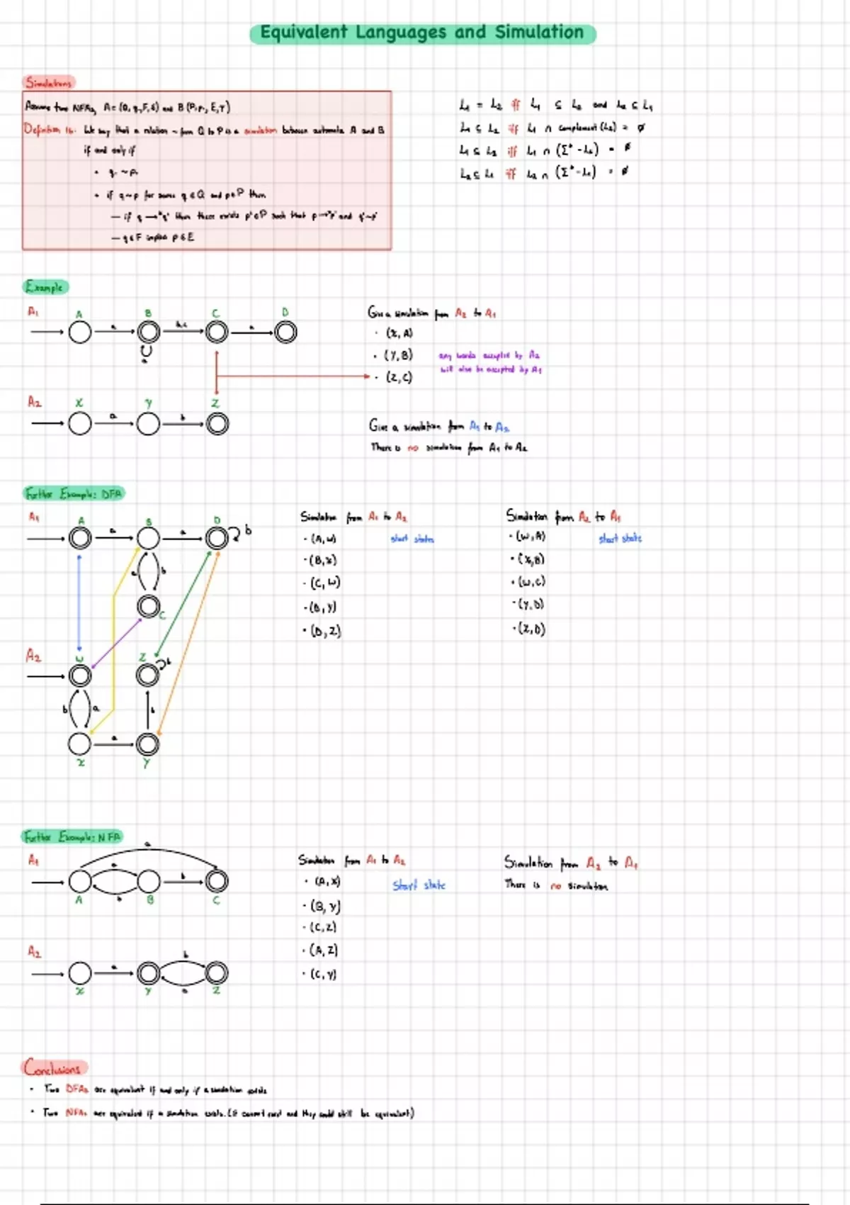 Two NFAs equivalent if simulation exists. (it cannot exist they could still be equivalent )