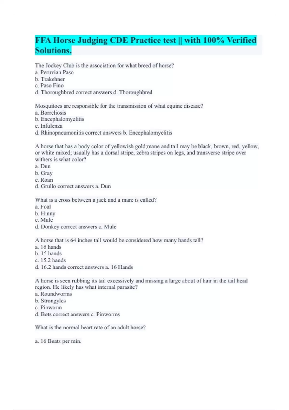 The Jockey Club is the association for what breed of horse? a. Peruvian Paso b. Trakehner c. Paso Fino d. Thoroughbred correct answers d. Thoroughbred Mosquitoes are responsible for the transmission of what equine disease? a. Borreliosis b. Encephalomyelitis c. Infulenza d. Rhinopneumonitis correct answers b. Encephalomyelitis A horse that has a body color of yellowish gold;mane and tail may be black, brown, red, yellow, or white mixed; usually has a dorsal stripe, zebra stripes on legs, and transverse stripe over withers is what color? a. Dun b. Gray c. Roan d. Grullo correct answers a. Dun What is a cross between a jack and a mare is called? a. Foal b. Hinny c. Mule d. Donkey correct answers c. Mule A horse that is 64 inches tall would be considered how many hands tall? a. 16 hands b. 15 hands c. 15.2 hands d. 16.2 hands correct answers a. 16 Hands A horse is seen rubbing its tail excessively and missing a large about of hair in the tail head region. He likely has what internal parasite? a. Roundworms b. Strongyles c. Pinworm d. Bots correct answers c. Pinworms What is the normal heart rate of an adult horse? a. 16 Beats per min.